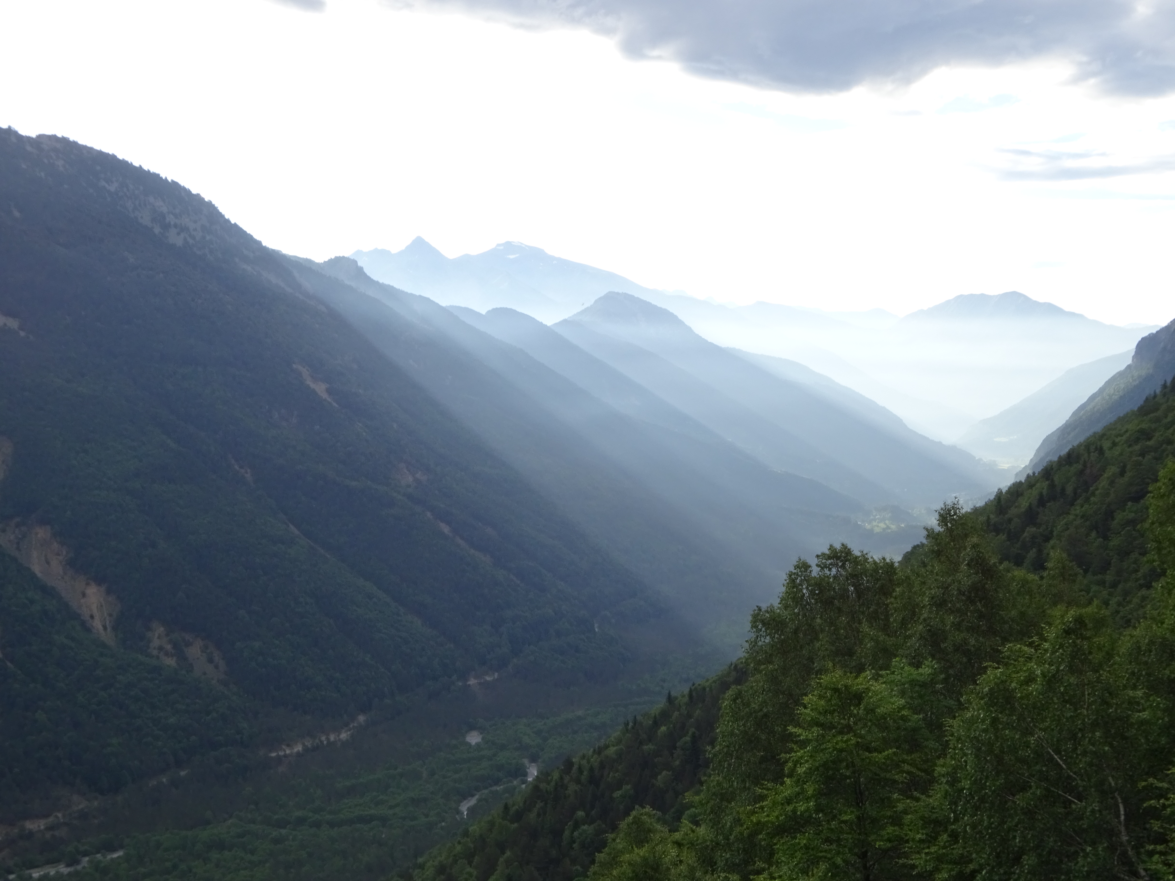 Superado el torrente el sendero vuelve a penetrar en el bosque y gira hacia la izquierda, desdibujándose y aumentando la pendiente. Después, sigue subiendo a media ladera por terreno más expuesto. Al cabo de una hora de camino nos damos un respiro y disfrutamos de las vistas que empiezan a abrirse sobre el Valle de Pineta.