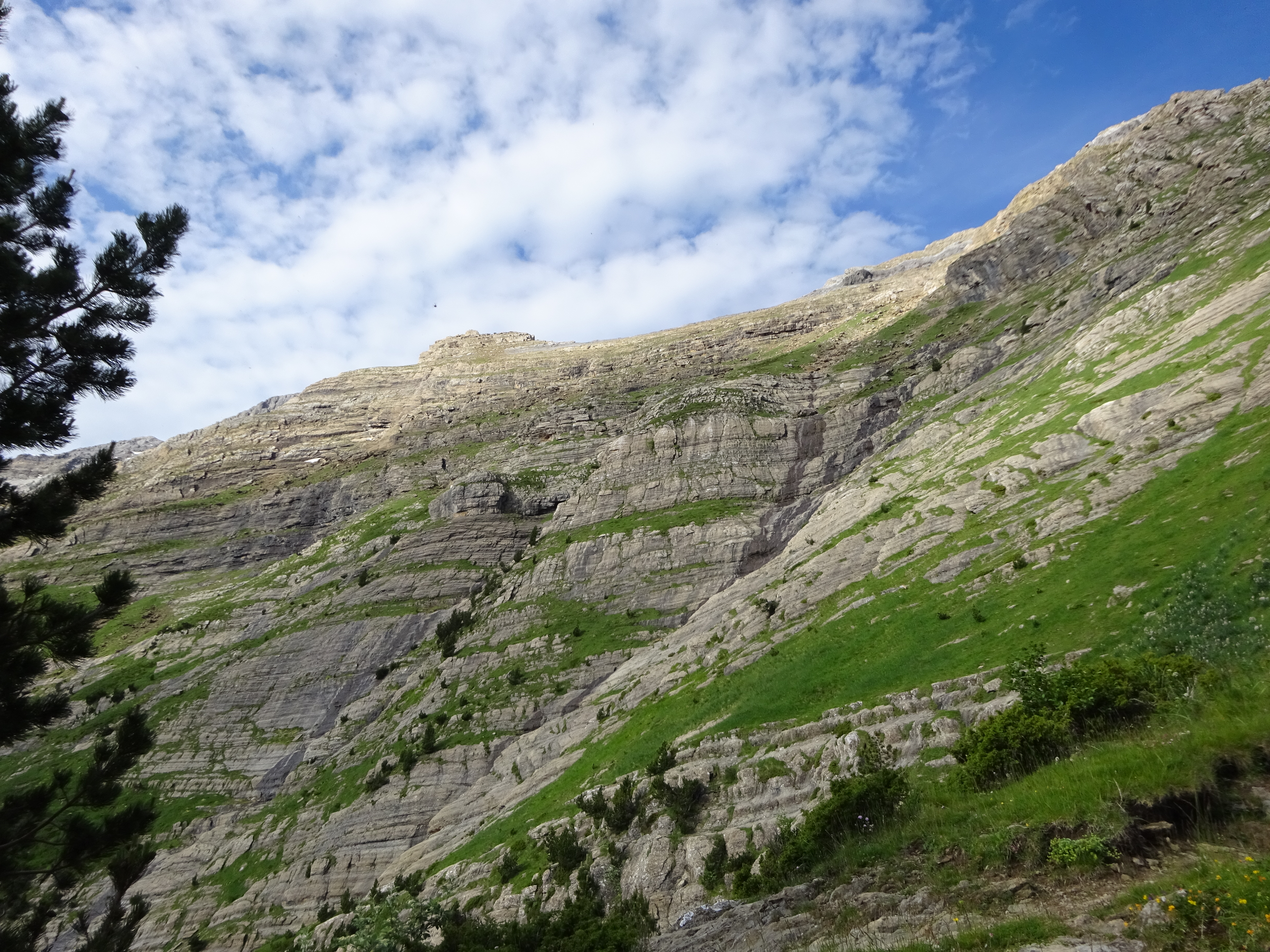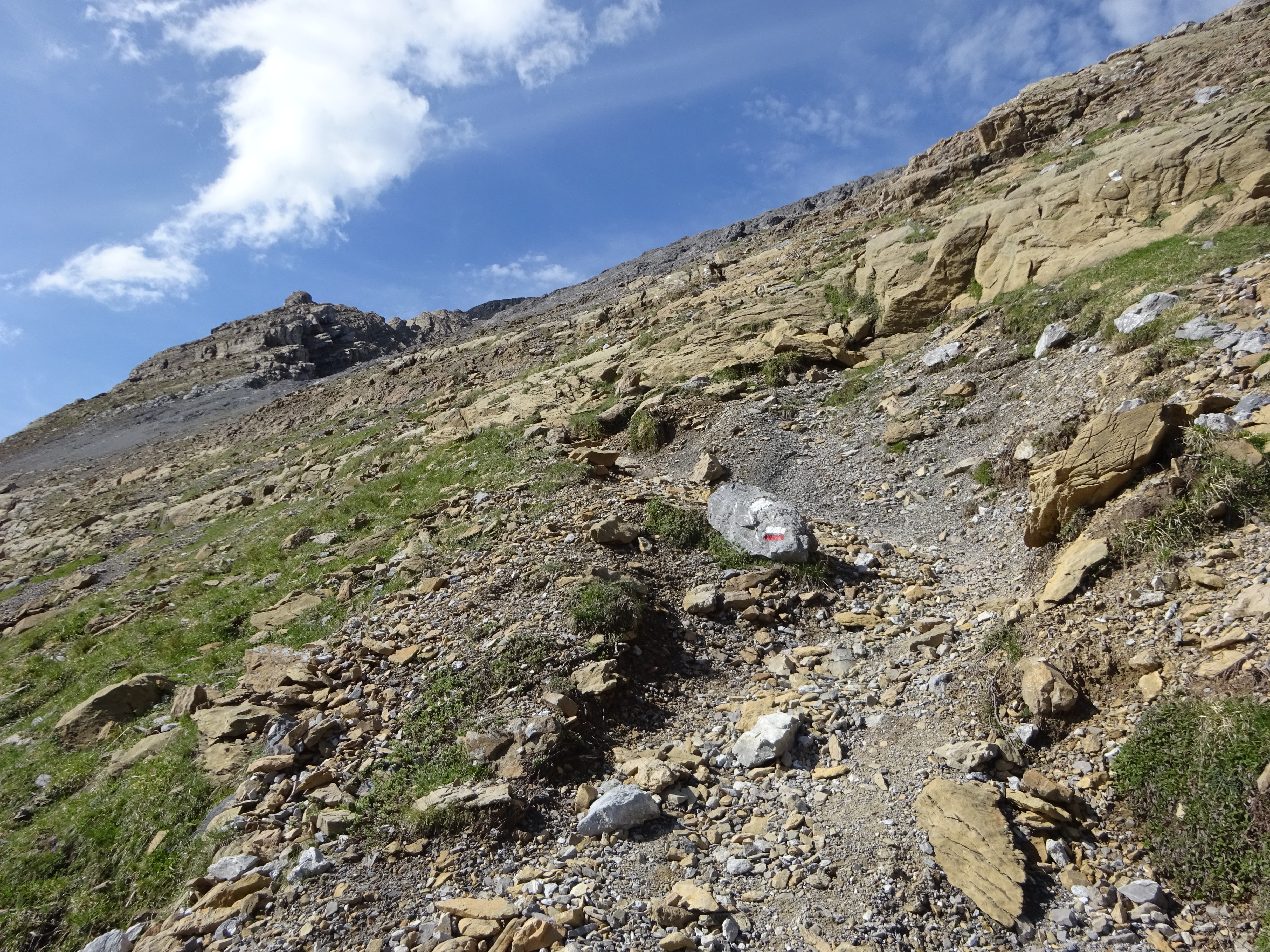 A partir de aquí el sendero vuelve a subir, y tenemos que estar atentos a seguir las marcas blancas y rojas, que pronto se desviarán a buscar la Faja de las Olas, con un pronunciado giro a la izquierda. De seguir rectos iríamos a la embocadura de la pedrera que desciende de la Punta de las Olas (la opción más breve, pero también la más fastidiosa, para alcanzar su cumbre), y aún más allá llegaríamos a las terrazas de Bellevue. Por aquí pasa una bella vía alternativa para subir al Añisclo, que impone algún paso de III en roca.