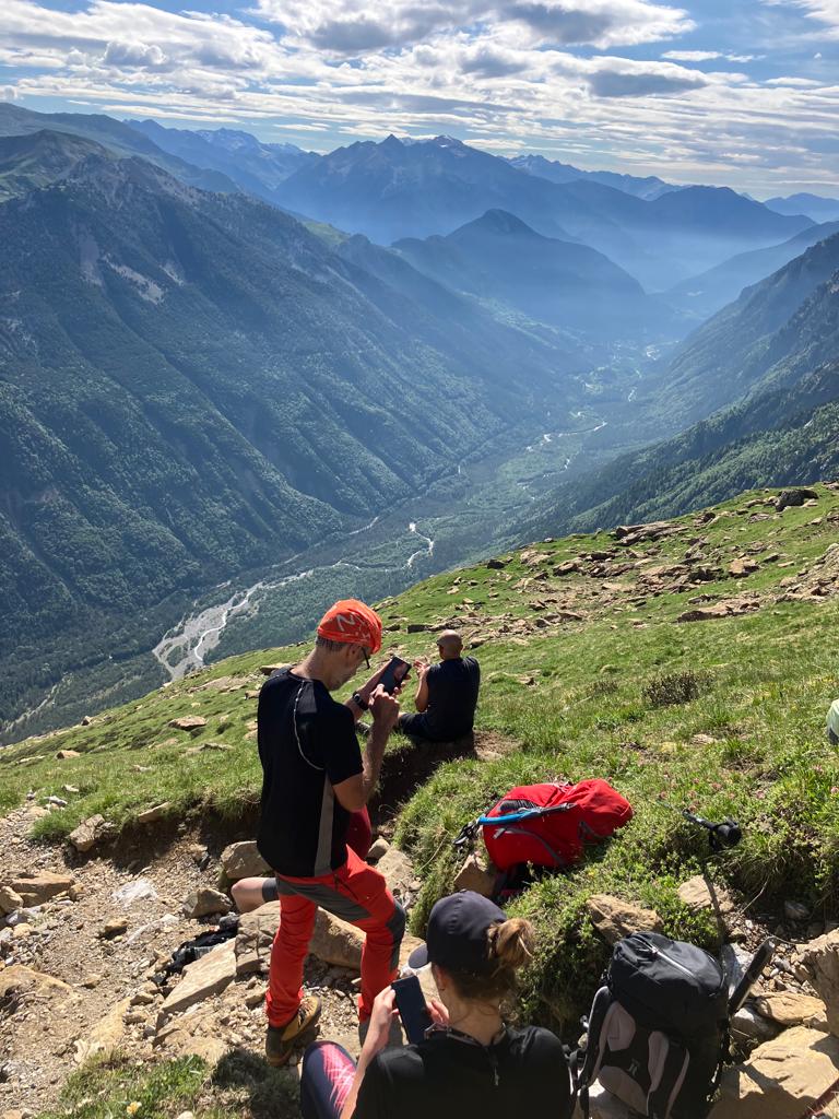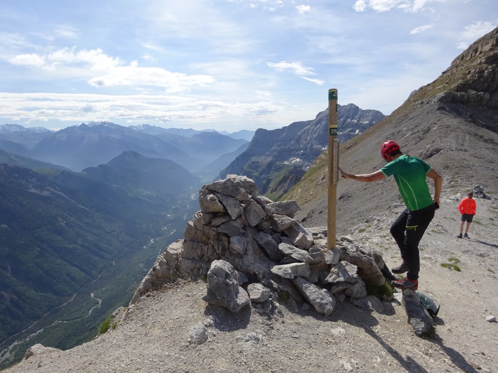 Son casi las tres cuando pasamos nuevamente por la cumbre. Mis molestias de estómago ya son historia y me siento mucho mejor. No nos detenemos y bajamos abuen ritmoo, pero hay dos personas que lo están pasando un poco mal. Hacemos un descanso al volver al cruce con el GR11 para poder esperarlos. Me quedaré con ellos a cola de pelotón mientras los más rápidos se apresuran a volver al Collado de Añisclo.