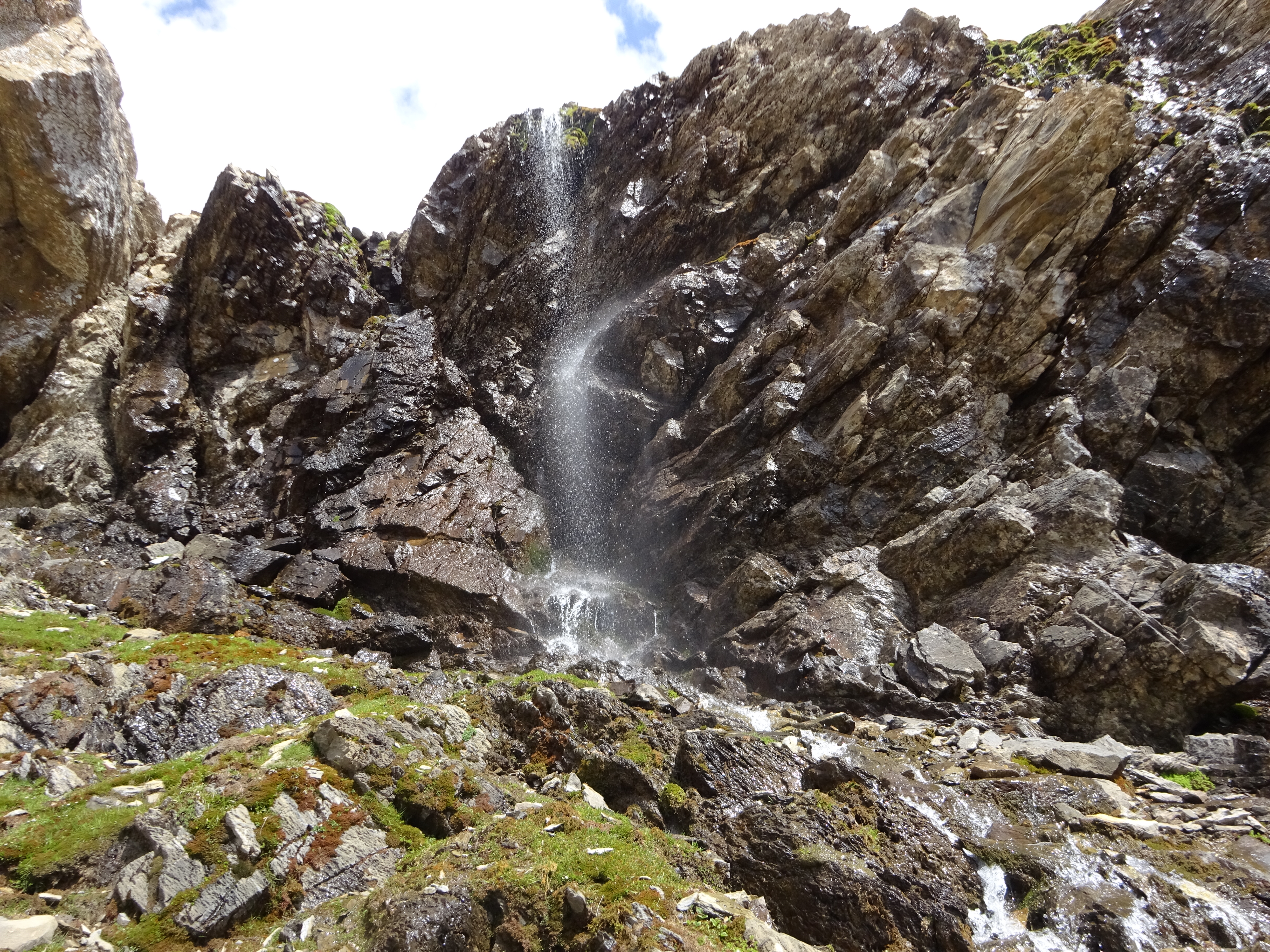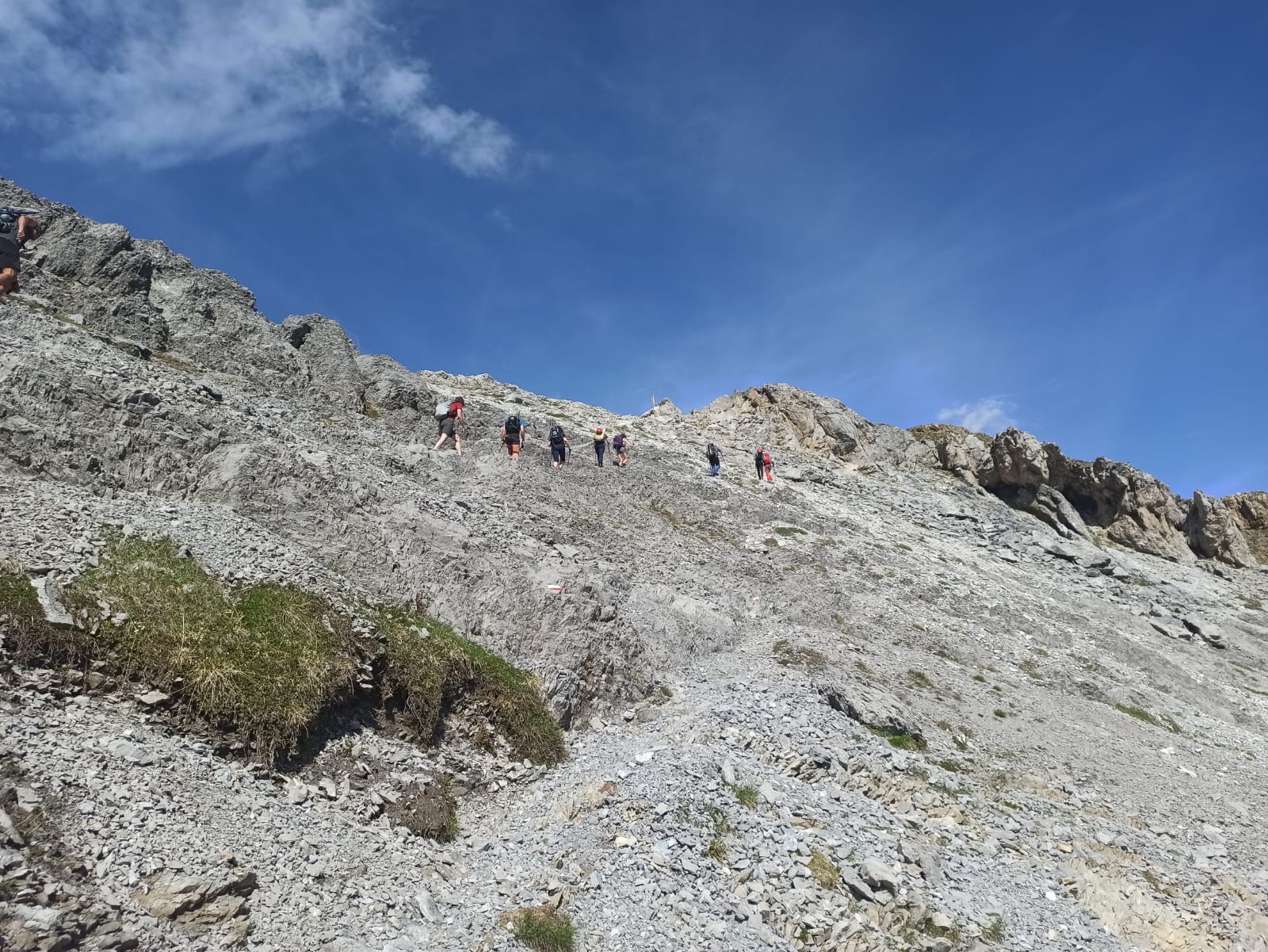 Tras una serie de zigzags el sendero sale a terreno totalmente despejado y podemos ver lo que nos espera. Serpenteando por praderas de altura, encontramos sobre los 2000 m, a ras de suelo, a la derecha, una fuente, donde rellenamos las cantimploras y camelbacks. Se continúa subiendo por terreno cada vez más pedregoso; el camino vira hacia la izquierda para salvar una cresta, penetra en un corredor de derrubios que se atraviesa siguiendo los hitos, y alcanza el borde opuesto. El cansancio empieza a hacerse notar, tiempo para un nuevo alto en el camino.