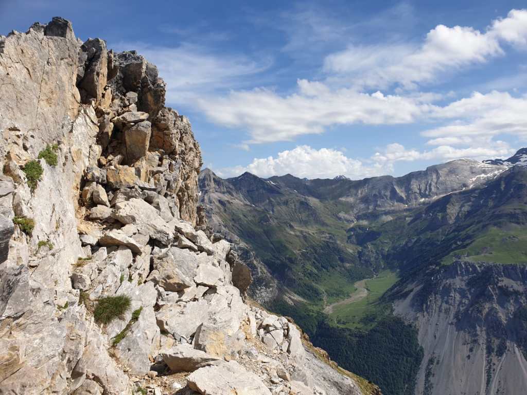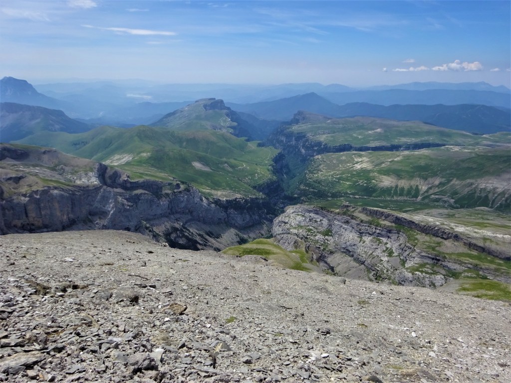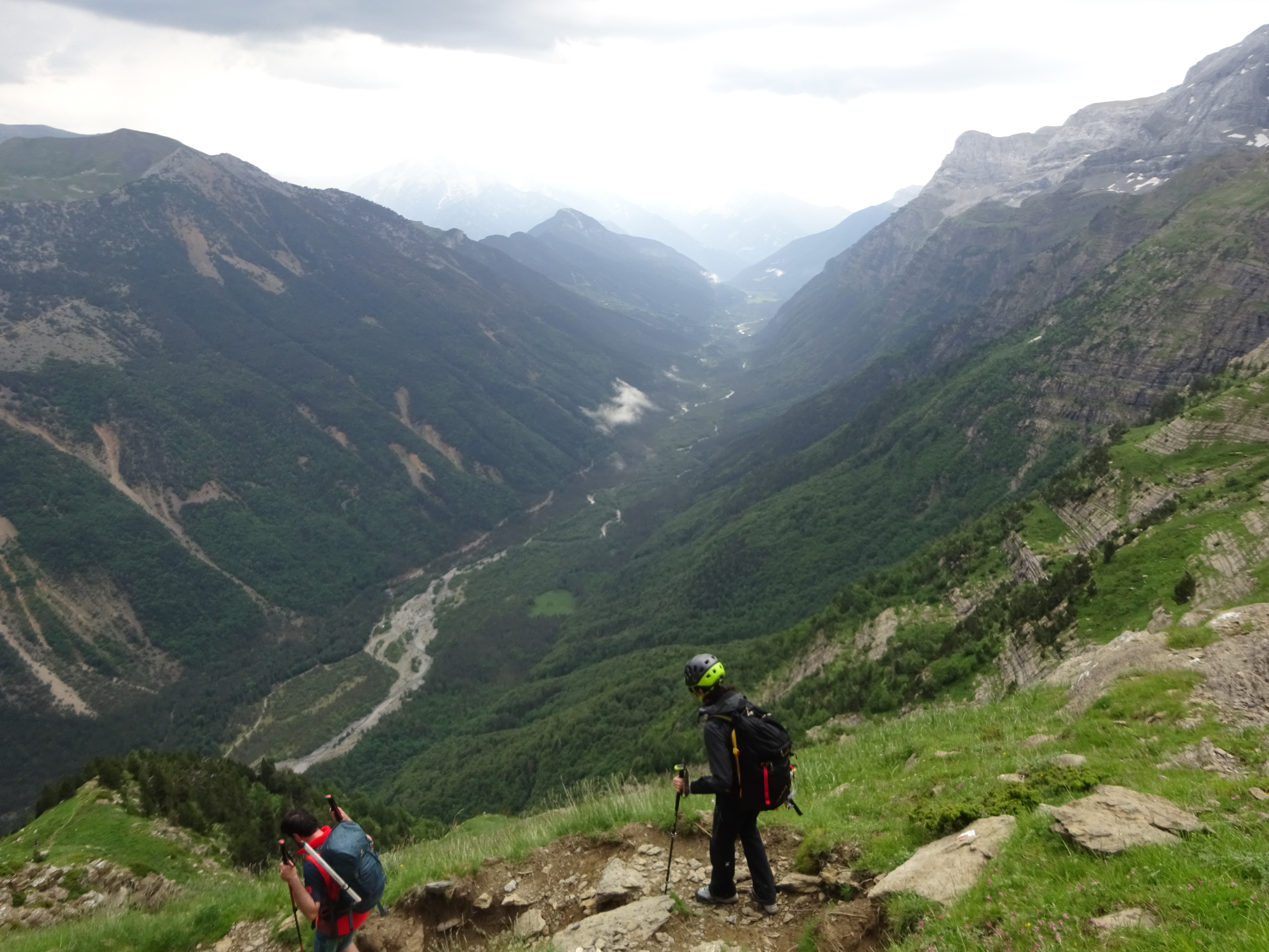 Las vistas son naturalmente amplísimas, con el valle del Cinca al norte y el cañón de Añisclo al sur, en disponsición perpendicular al valle de Pineta. Siguiendo la cresta, el escarpado Pico Inferior de Añisclo nos domina hacia el SE. Encontramos aquí a un excursionista que ha llegado desde Góriz y se dirige al Refugio de Pineta. Sería la única persona que veríamos hasta la cima de las Olas. Una vez reunidos todos, seguimos adelante. Es preciso estar atentos porque aquí el GR11 se bifurca, ofreciendo dos alternativas para llegar al Refugio de Góriz. La primera desciende hacia la Fuenblanca, en el alto cañón de Añisclo, a unos 1800 m, imponiendo por tanto remontar un desnivel positivo adicional; a cambio, no presenta peligros objetivos relevantes. Se trata del camino que aparentemente se dirige hacia la Punta de las Olas, pero en claro descenso. Es importante no equivocarse y evitar continuar por aquí, más bien habrá que seguir por el GR11 alternativo, cresteando para alcanzar la modesta Punta del Valle (2501 m) y bajar suavemente al otro extremo del collado, también denominado Collado de los Maquis. Alternativamente se puede llegar aquí rodeando la Punta del Valle siguiendo trazas de sendero por la pedrera.