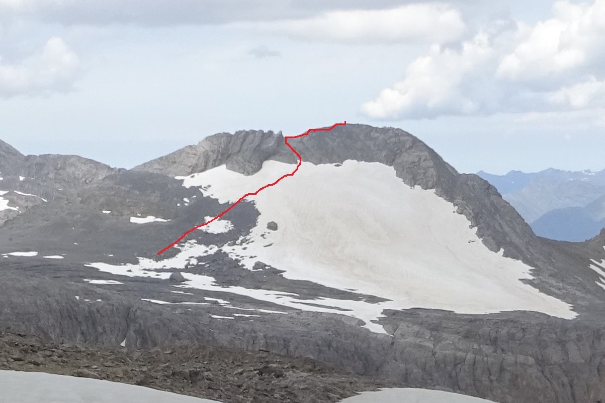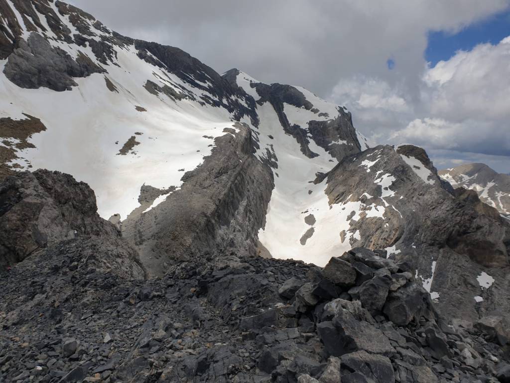 En el collado, a nuestra izquierda según descendemos, se encuentra la sima de las Olas, la cavidad más alta de Europa. No tenemos tiempo de ir a buscarla. Vamos siguiendo trazas entre la roca y la nieve que se desvían a la derecha, con hitos dispersos, buscando nuestro objetivo. El terreno no es empinado pero la roca está muy descompuesta. Empiezo a subir por la cresta noroeste del pico, pero pronto nos damos cuenta de que nos conduce a pasos complejos y muy expuestos hacia la izquierda, así que volvemos a bajar e iniciamo un flanqueo hasta que encontramos el camino bueno remontando un empinado nevero. Aquí al menos sacaremos partido de los crampones que hemos cargado durante horas.