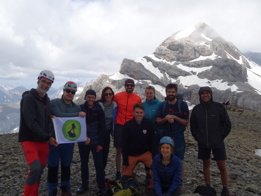 Finalmente, tras no poco sufrimiento, alcanzo los 3022 m de la cumbre a la una y cuarto. El tiempo claramente se está deteriorando, y pocos son los miembros del grupo que se sienten lo bastante en forma como para intentar llegar al Pico Añisclo. Hemos tardado seis horas, hemos ido más lentos de lo previsto pero sobre todo estamos pagando el haber salido demasiado tarde, en buena medida «forzados» por el horario de desayuno del refugio.