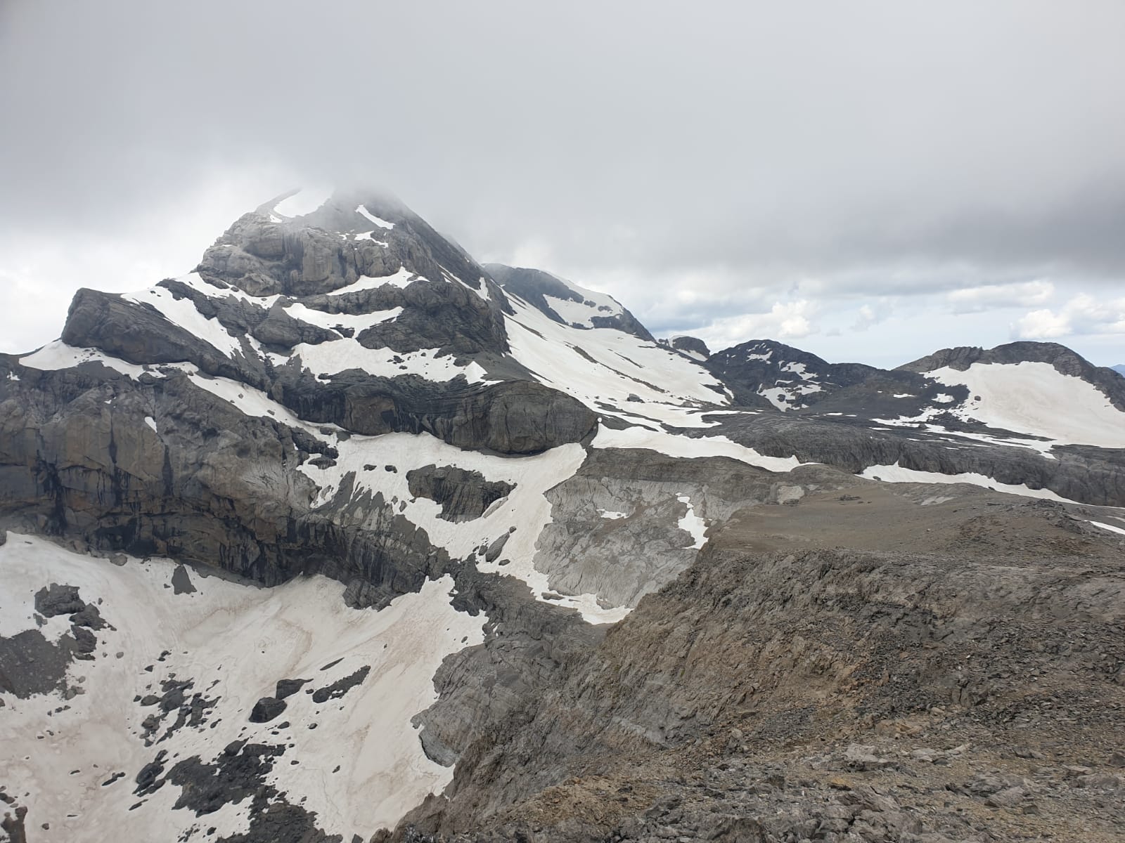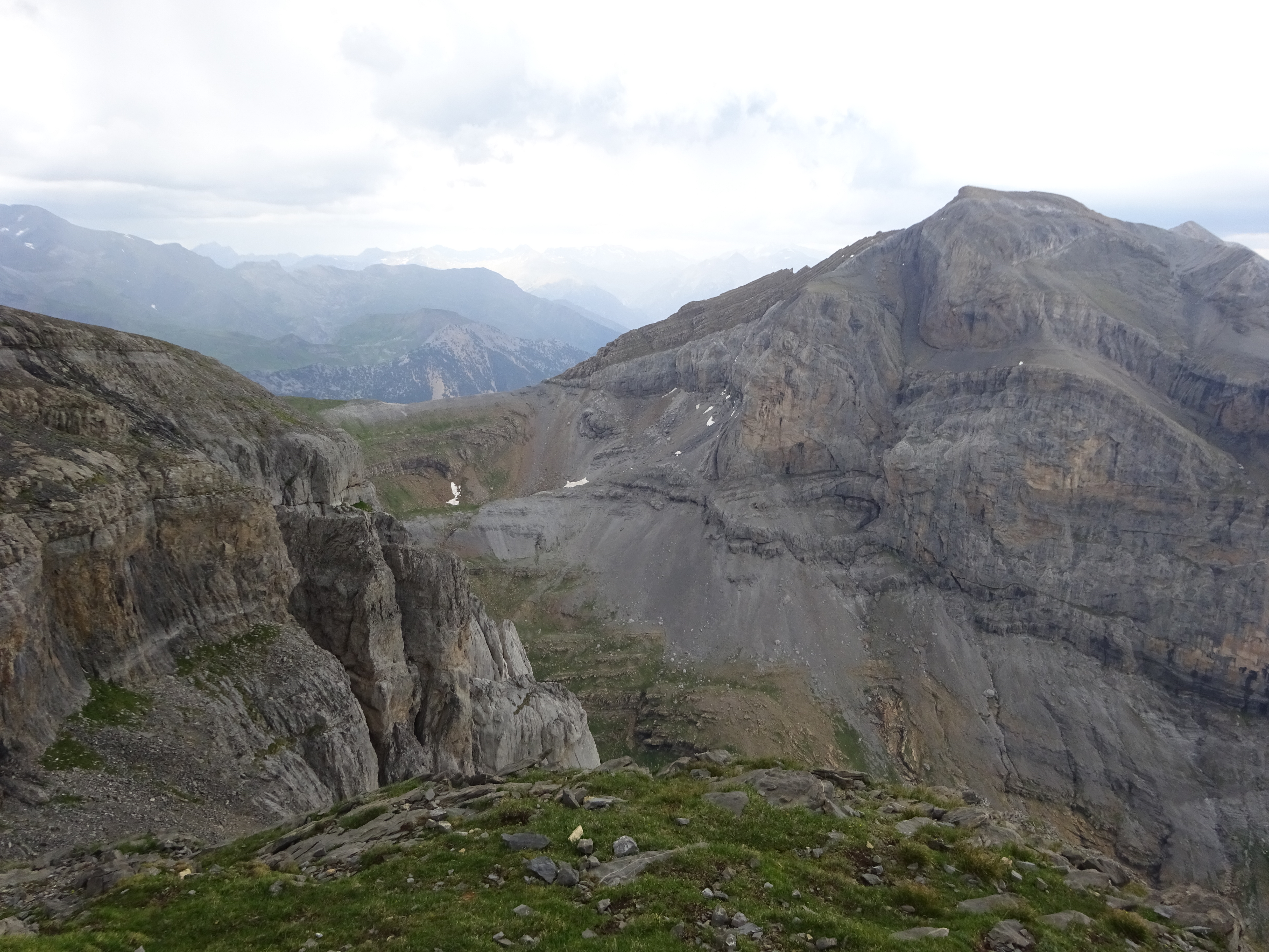 El paisaje ha cambiado, hemos pasado de las vistas profundas hacia los cañones y valles a un desierto mineral donde la nieve hace aparición de forma más consistente. La pared suroeste del Pico Añisclo aparece en primer plano, y detrás se insinúa el Monte Perdido. A la derecha una montaña más modesta nos llama la atención; se trata del Baudrimont SW o Punta Tormosa. Esta yo la tenía como tresmil adicional de vuelta del Pico de Añisclo, pero ahora se convertía en una alternativa al objetivo principal de la excursión.