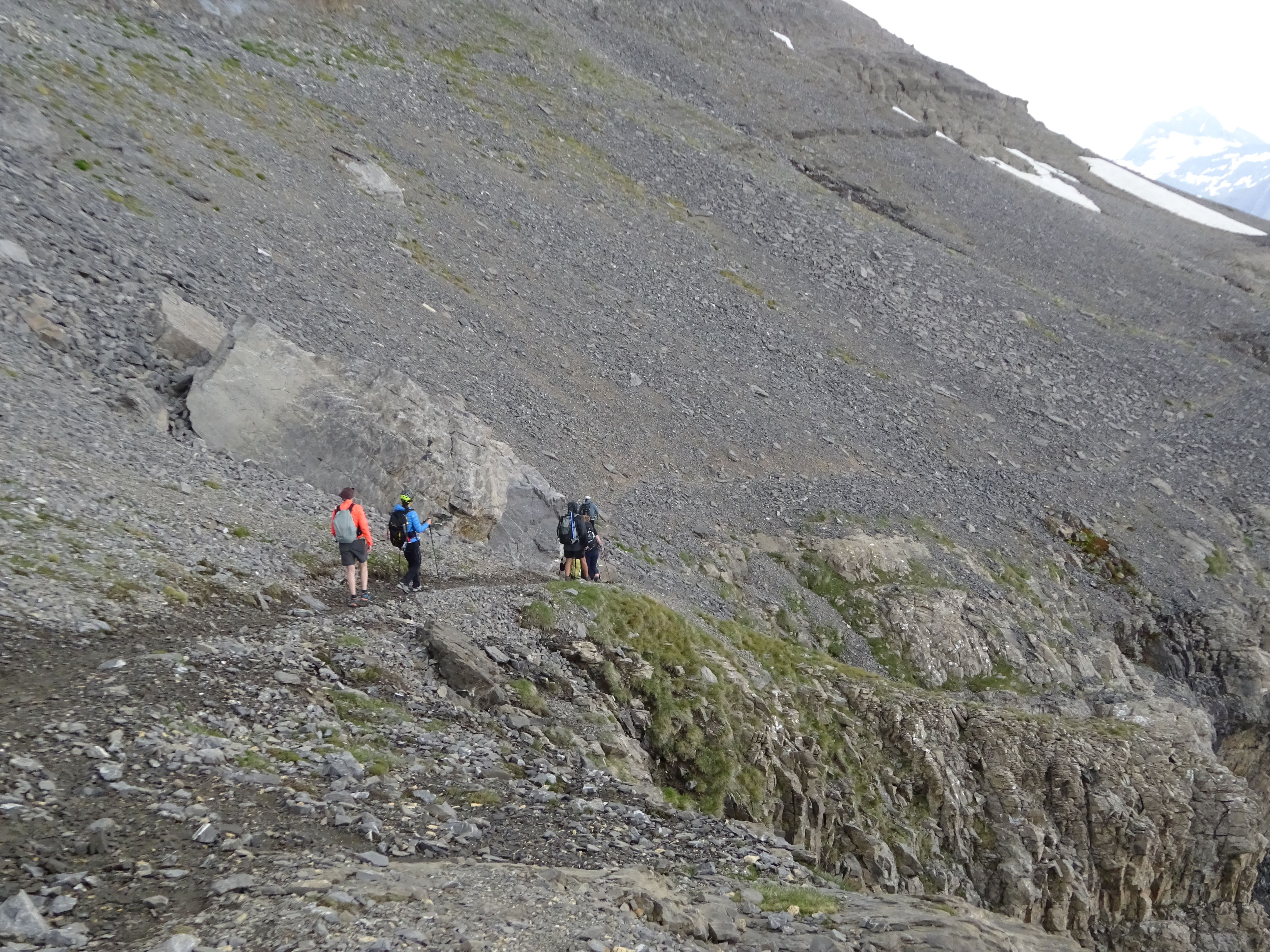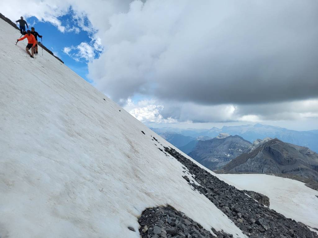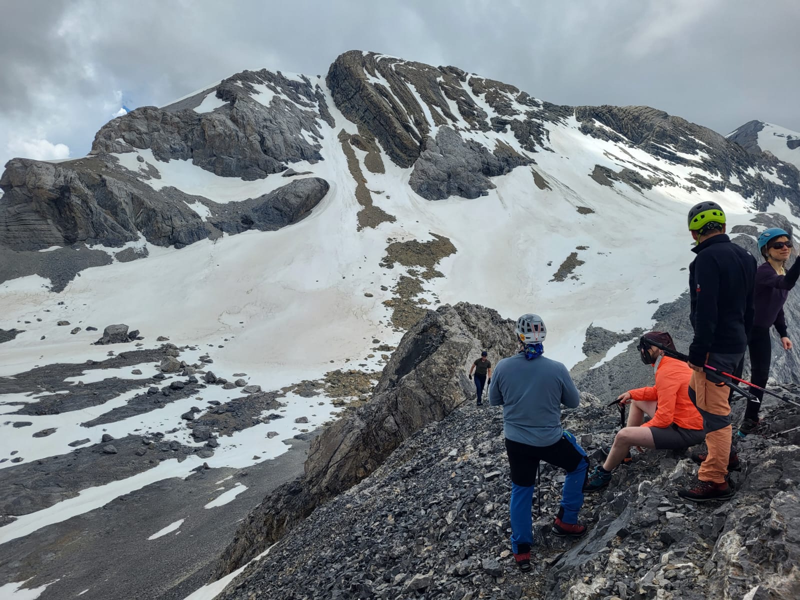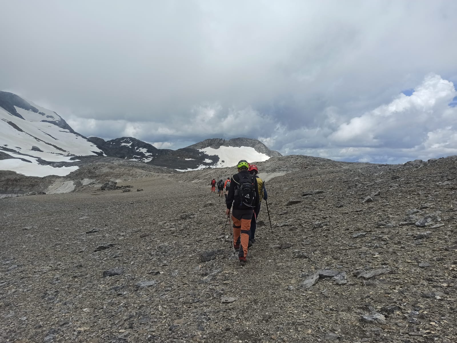 Esto nos lleva a consideraciones de tipo más general que explican el no haber conseguido el objetivo principal, y que constituyen valiosas lecciones para una ocasión posterior. Un grupo más numeroso es siempre más lento, obvio. La elección de la temprana estación tiene la indudable ventaja de disponer de más horas de luz, menos calor y presencia de abundante agua, esencial en una carrera tan larga, pero al mismo tiempo la persistencia de neveros en la parte alta obliga a cargar con piolet y crampones. Finalmente, la especial relevancia de la meteorología cuando hay que caminar tantas horas, ya que las tormentas vespertinas acortan el tiempo útil a disposición. Valórense pues estos factores a la hora de planificar una ascensión que requiere rigor y método.