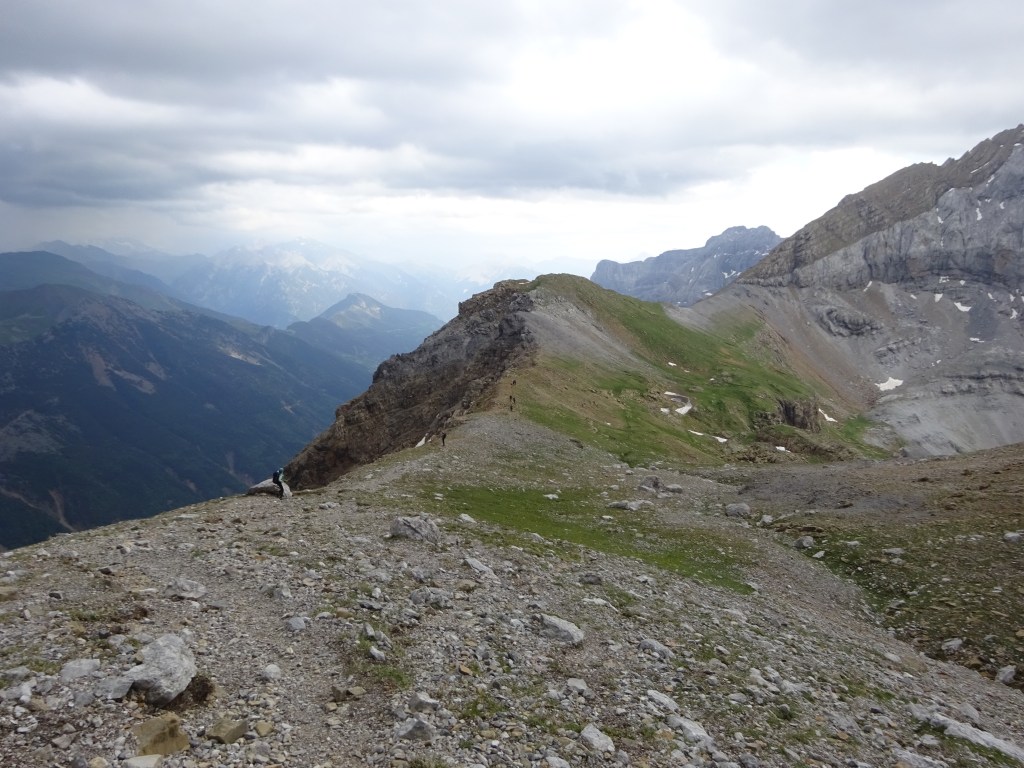Con una previsión meteo óptima nos habríamos planteado seguir hasta el Añisclo, visto que tendríamos luz hasta las diez de la noche. Pero había que cambiar de planes, así que entre darnos la vuelta y proseguir hasta la punta Tormosa nos decidimos por añadir un segundo tresmil a la buchaca. Así que emprendemos camino por la vertiente contraria, descendiendo dulcemente por el lomo de la cresta pedregosa (NW), en dirección a la amplia vaguada de derrubios (2965 m) que constituye la terraza superior paralela a la de Bellevue, entre la Olas, el Añisclo y la Punta Tormosa.