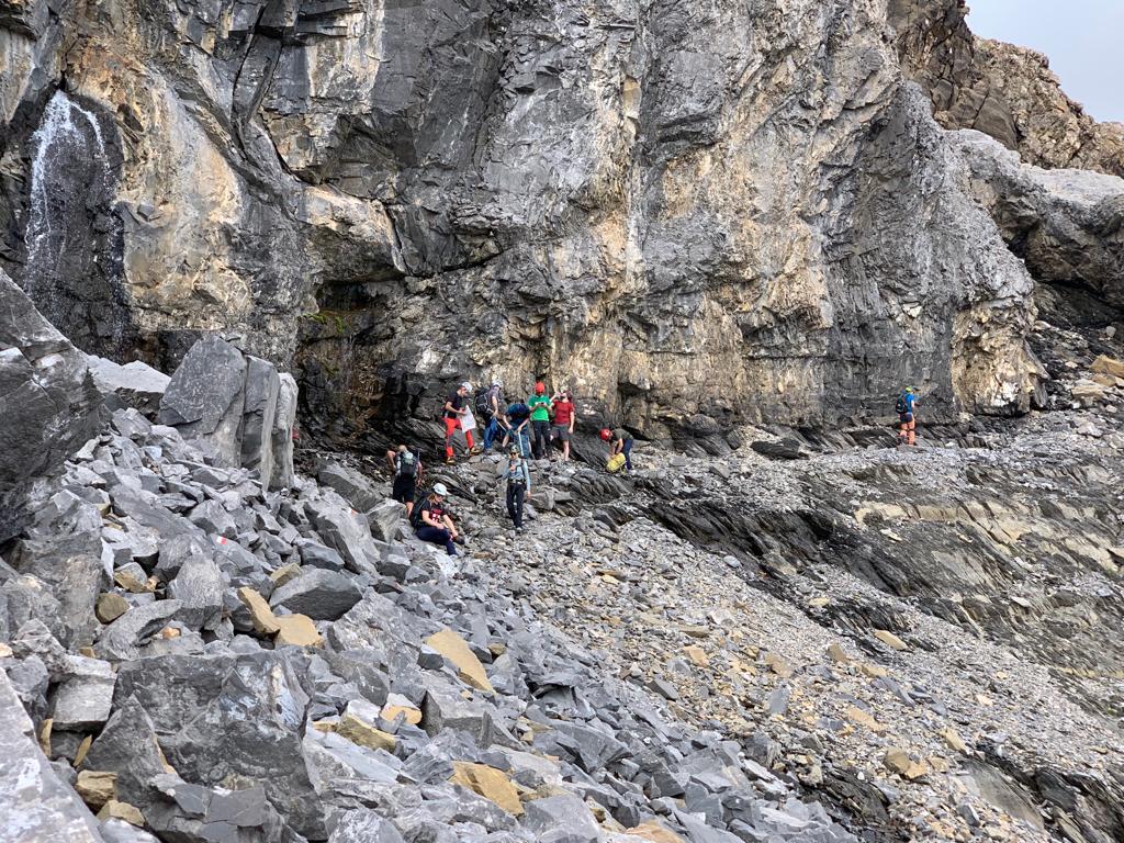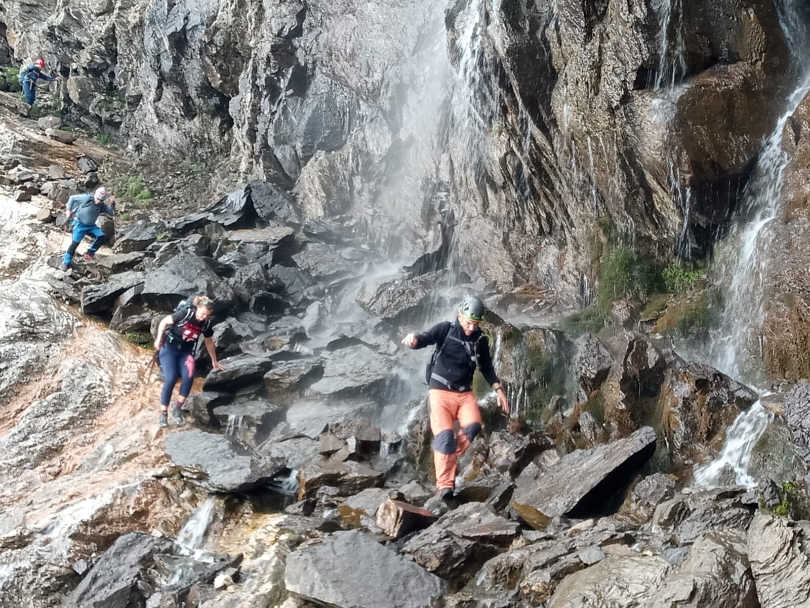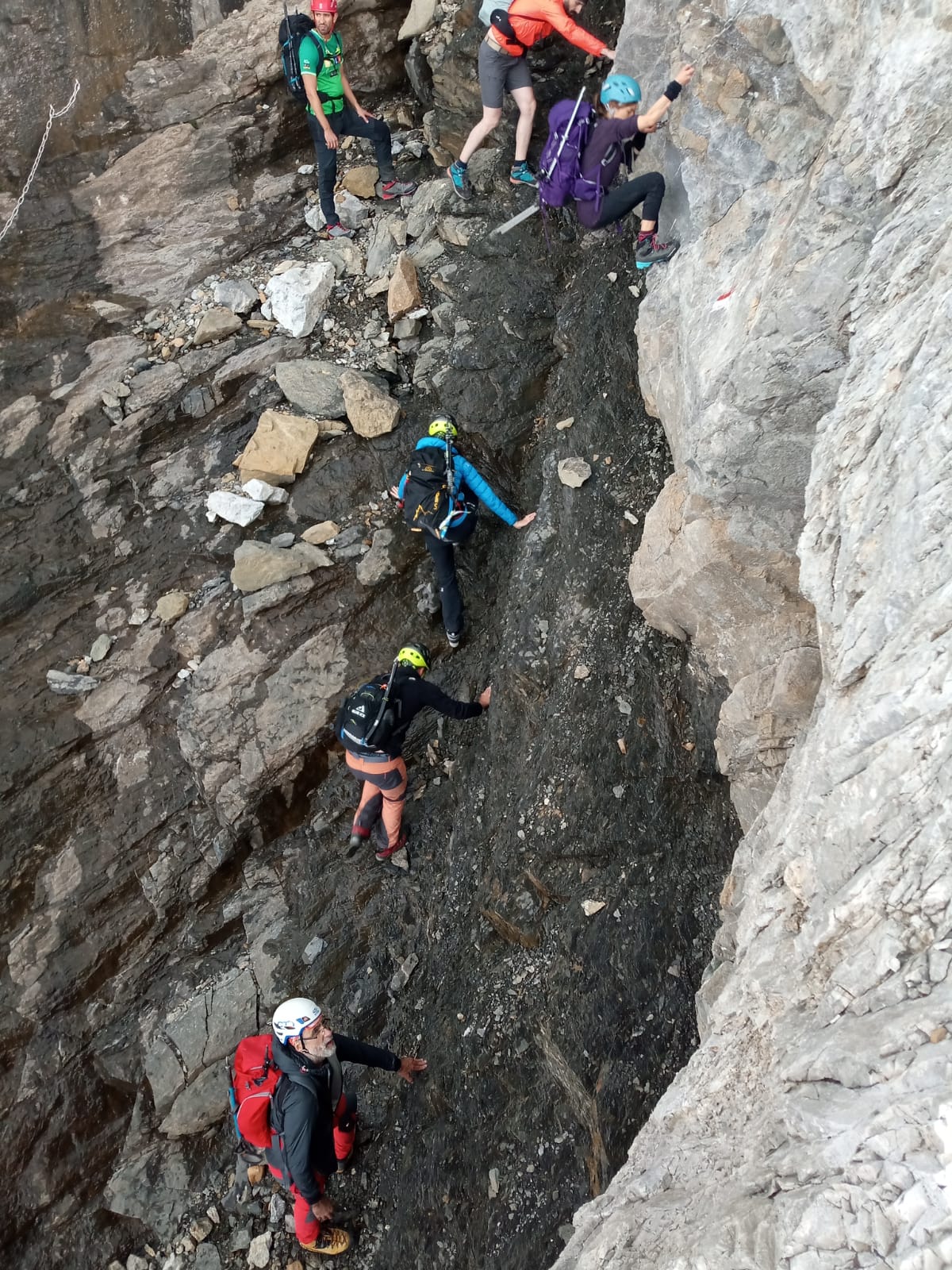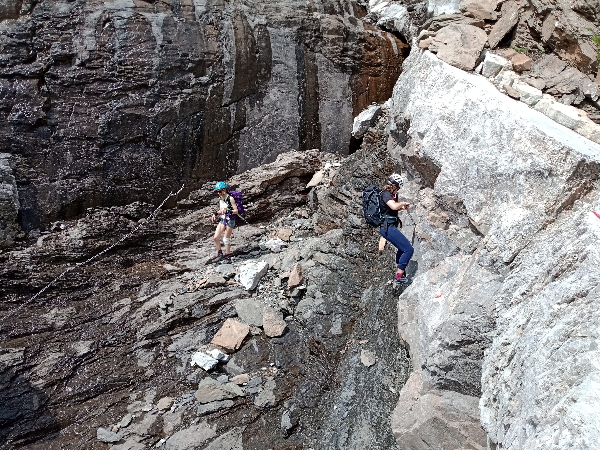 Sigue un tramo sencillo y enseguida llegamos al punto clave, un salto rocoso que nos deposita en lo alto de un corredor de roca suelta que se flanquea lateralmente. Ambos pasos, donde una caída podría tener serias consecuencias, están auxiliados por cadenas, siendo el primero, que impone un poco de juego de piernas, el más complicado.