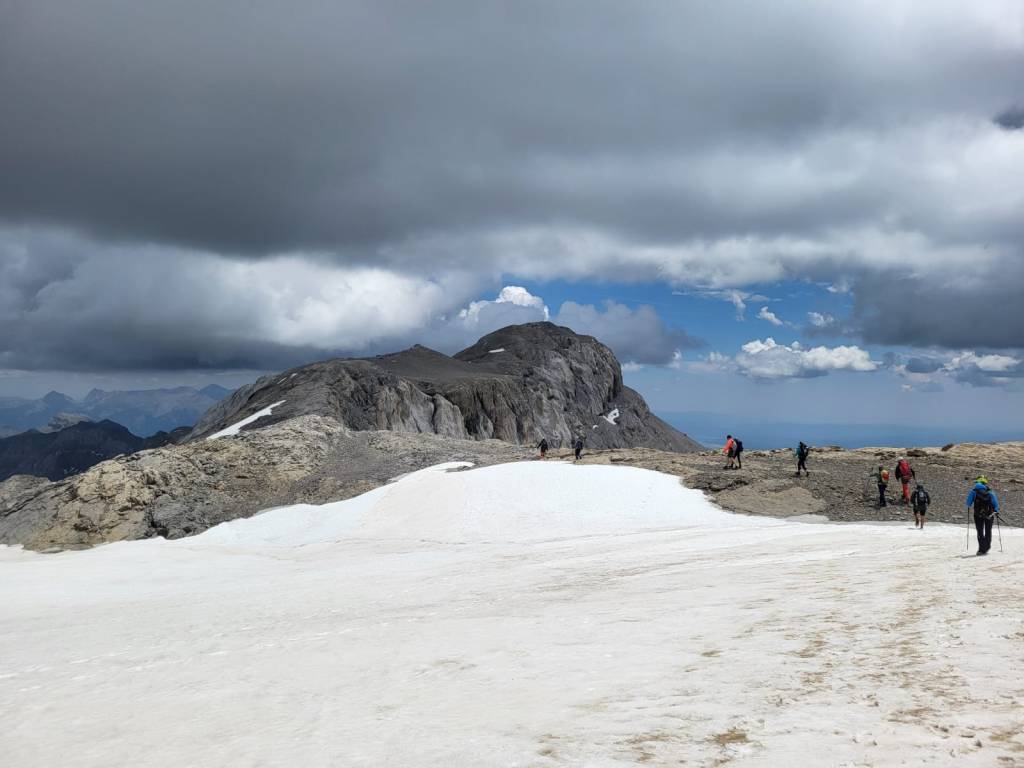La cumbre del Monte Perdido aún está libre de nubes, aunque poco le falta. Hay una bestialidad que algunos montañeros fuera de los común son capaces de llevar a cabo en una sola jornada, la travesía de las Tres Sorores. Alcanzado el Pico Añisclo, encadenarlo con el Monte Perdido, bajar por la Escupidera y subir al Cilindro, para ir al Collado del Cilindro, emprender la delicada bajada al Balcón de Pineta y desde ahí vuelta a Pineta. Una actividad tan completa como abrumadora.