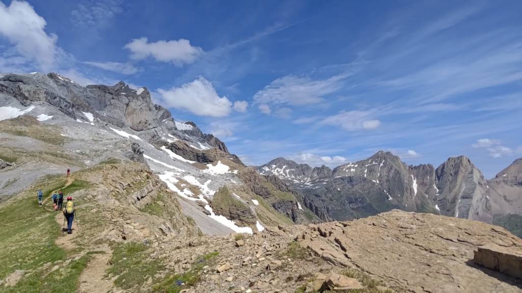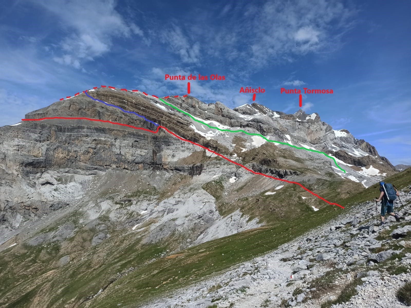 Finalmente, a las once menos veinte alcanzamos nuestra ansiada primera meta. Ya vamos tardando un poco más de lo previsto y hay miembros del grupo que lo están pasando mal. Desde aquí ya divisamos nuestros objetivos, que se ven relativamente cercanos. La Punta de las Olas, con su antecima en primer plano, y detrás el Pico Añisclo y la Punta Tormosa o Baudrimont SE.