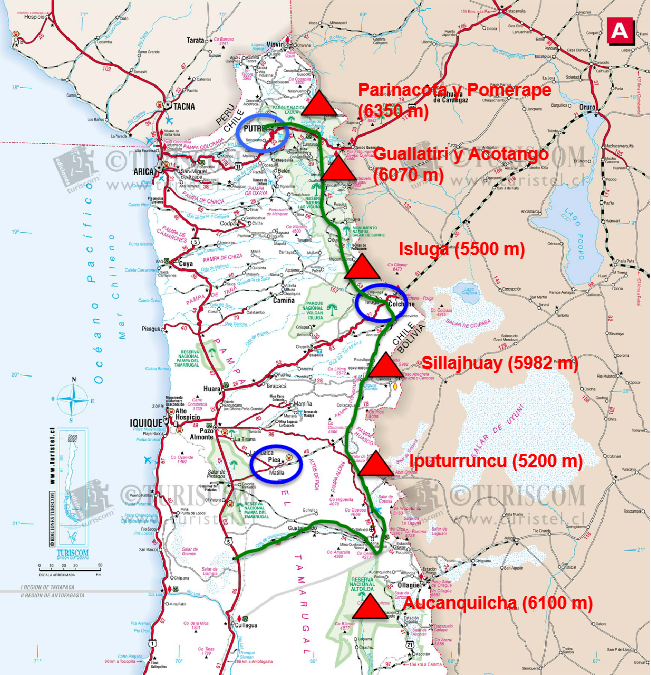 Conozco bien esta zona. Situada en el norte de Chile, sobre la frontera con Bolivia, aquí se abre todo un mundo de posibilidades para combinar el proceso de aclimatación con el turismo y la exploración. Además está bien servida de carreteras de altitud y es posible alojarse en hostales y pensiones, facilitando así la logística y el buen descanso, sin perjuicio de una buena aclimatación. El lugar que elegiría para hacer de campamento base sería la pequeña localidad de Putre, en el extremo norte del país, excelentemente comunicado junto a la carretera internacional Arica-La Paz. A poco más de una hora en auto del punto de partida de los seismiles de la zona, se encuentran aquí todos los servicios, hoteles, restaurantes y supermercados, necesarios para una estadía confortable. Mientras que sus 3500 m de altitud permiten dormir a una cota lo suficientemente elevada como para permitir una buena aclimatación.
