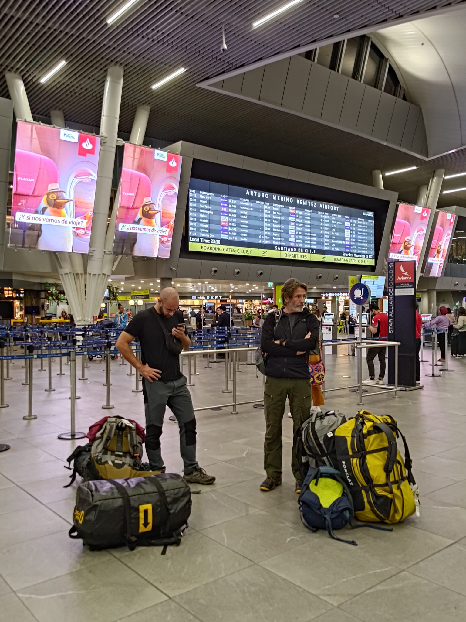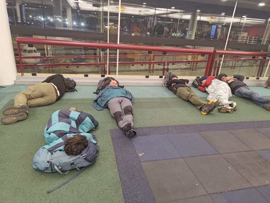 No es sencillo empaquetar todo lo necesario para una expedición andina en un petate de 90 litros con peso máximo de 23 Kg y una mochila de equipaje de mano. Mis botas La Sportiva Nepal Cube de la talla 49 ocupaban casi la mitad del petate. Piolet y crampones habían entrado, no así el saco de dormir, que tendría que alquilar en Copiapó. La salida de Barcelona es a las 10.50, así que el madrugón es relativo y llego a tiempo para encontrar a mis compañeros en la cola del mostrador de facturación de Iberia, que como de costumbre es larga y lenta. Afortunadamente ninguna maleta se pasa de peso y la azafata nos aconseja pasar el control de seguridad por un acceso poco conocido, que resultó ser el que usan los del puente aéreo. Auténtica experiencia VIP, sin esperas y con guardias de seguridad amables y sonrientes. El vuelo de enlace a Madrid transcurre con normalidad y transbordamos a la Terminal 4S de Barajas sin agobios, desde donde parte nuestro Airbus 350 rumbo a Santiago poco después de la una y media. Ya estoy acostumbrado a este larguísimo vuelo de trece horas, pero esta es la primera vez que lo hago de día, hasta ahora siempre había salido pasada la medianoche. Apenas hay turbulencias, ni siquiera al sobrevolar el Atlántico ecuatorial o cuando atravesamos la cordillera de los Andes. Eso sí, Iberia nos mata de hambre en esta ocasión. Dormitar, dormito algo, y cuando aterrizamos en Santiago a las diez y media de la noche toca nuevamente hacer cola para el control migratorio y aduanas. Pero al menos no hay prisas, hasta las cinco y media de la mañana no sale el vuelo doméstico de LATAM a la ciudad de Calama, donde comienza nuestra aventura. El aeropuerto ha cambiado desde mi última vez hace cuatro años, ahora hay una terminal internacional nueva y la antigua ha quedado para vuelos nacionales. Allá vamos soñolientos, con nuestros maletones, y tras descubrir que no hay consignas para dejar el equipaje nos vamos a buscar un sitio para cenar. Bastantes sitios están abiertos, y finalmente a la una de la madrugada nos podemos sentar alrededor de una mesa, relajarnos y cenar de verdad. La primera comida de la expedición. Tras lo cual buscamos de facturar el vuelo hacia Calama tan pronto como abren los mostradores.