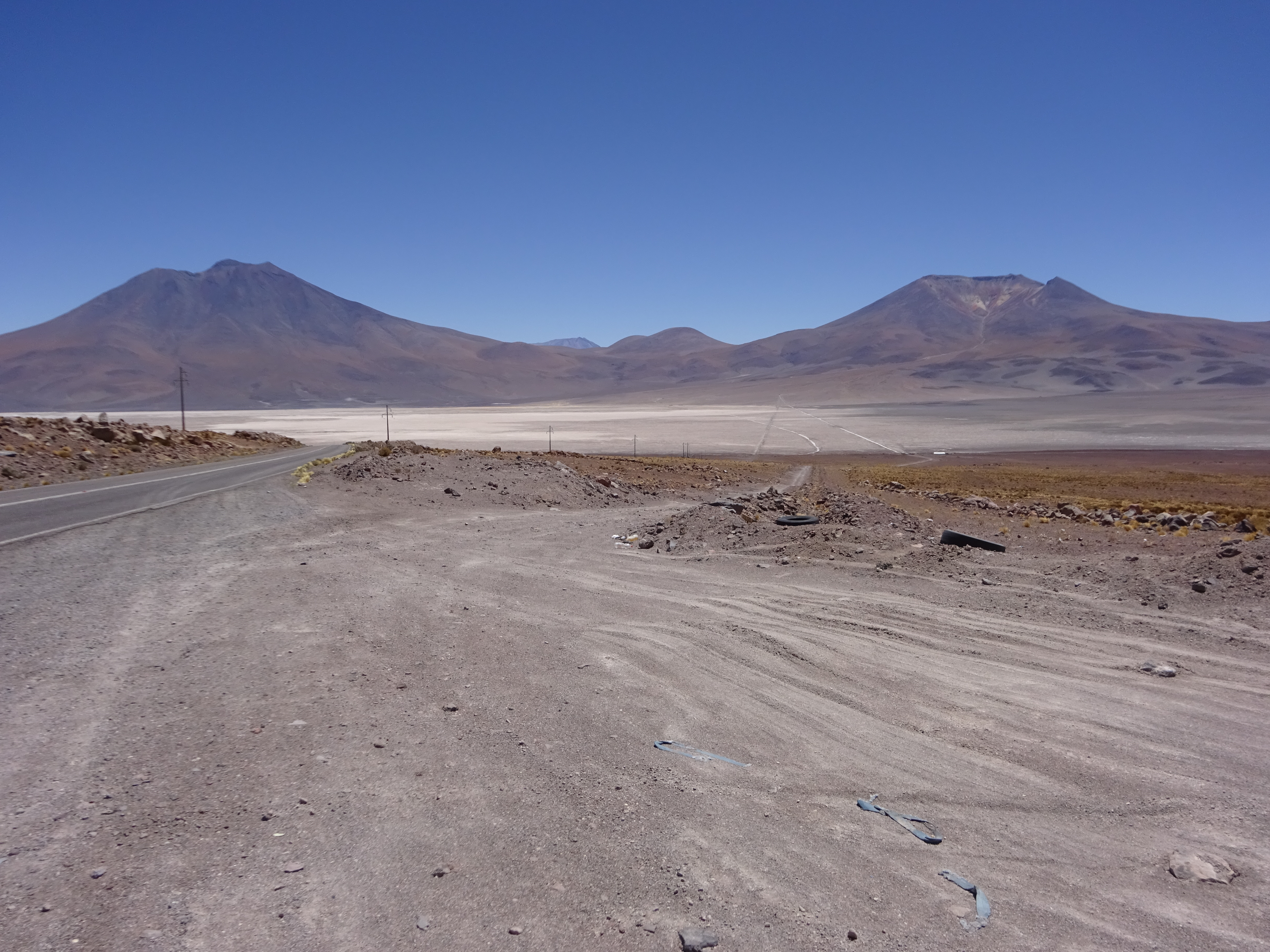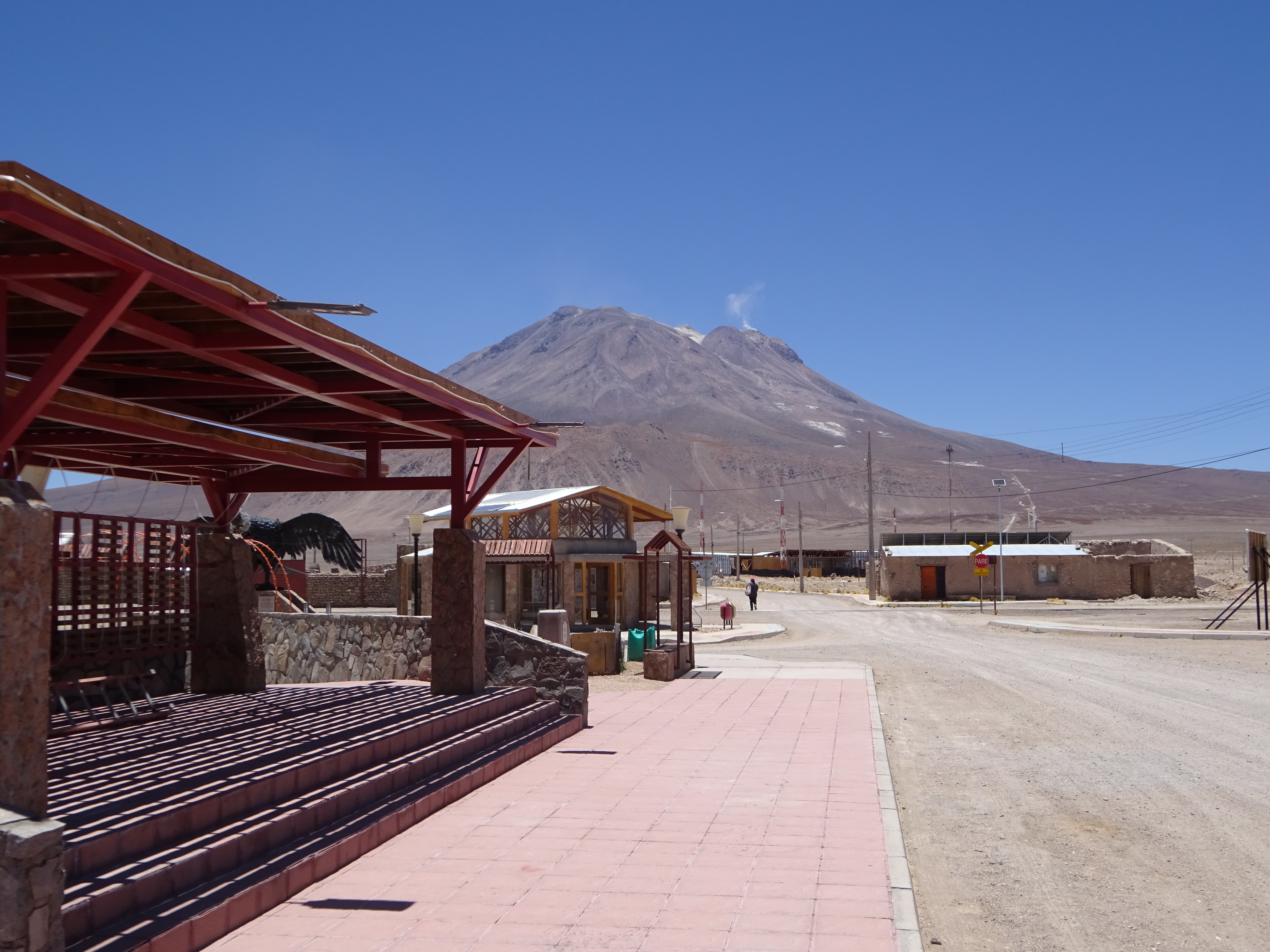Es ya pasado el mediodía y tras una breve parada turística nos enfrentamos al inicio propiamente dicho de la travesía del Altiplano. El primer objetivo sería alcanzar la gran mina de Collahuasi, y desde allí, por terreno que ya conocía bien, ir hacia el Salar de Huasco y bajar a Pica. Tomaríamos la «carretera» B97. Tras errar la salida del pueblo yendo a parar al campamento militar, dimos con la pista un poco más hacia el este. Y digo bien, pista. Como acabo de mencionar, esta parte del recorrido, hasta Collahuasi, era nueva para mí. Me esperaba una carretera sin asfaltar relativamente bien mantenida, y bueno, sí, hasta cierto punto. Al cabo de pocos kilómetros llegamos a un cruce importante. Se incorpora por nuestra izquierda la carretera B15A, que seguiremos a partir de ahora en dirección norte. Hay postes kilométricos e indicaciones en algunos de los cruces, pero a tramos la pista se vuelve arenosa o bien estrecha y pedregosa, de forma que en algunas ocasiones hay que engranar la tracción a las cuatro ruedas. Vamos subiendo casi sin darnos cuenta, con algunas rampas que obligan a una conducción algo más atenta, pero el coche responde bien, de momento… El paisaje va ganando en amplitud, circulamos sobre los 4000 m, es una gozada. Hacia el suroeste aparece imponente una de las montañas más características de la zona, el Aucanquilcha (6178 m), un estratovolcán aún activo, inconfundible por su forma trapezoidal y su accidentada cresta cimera (con hasta cuatro cumbres) de la que se desprenden coladas claras de azufre. Precisamente, hasta 1993 estuvo activa aquí la mina más alta del mundo, a casi 5600 m, y la localidad de Aucanquilcha, a 5334 m, es el campamento minero a mayor altitud. Como curiosidad, la antigua pista de servicio de la mina permite llegar hasta las inmediaciones de la cima en bicicleta de montaña.