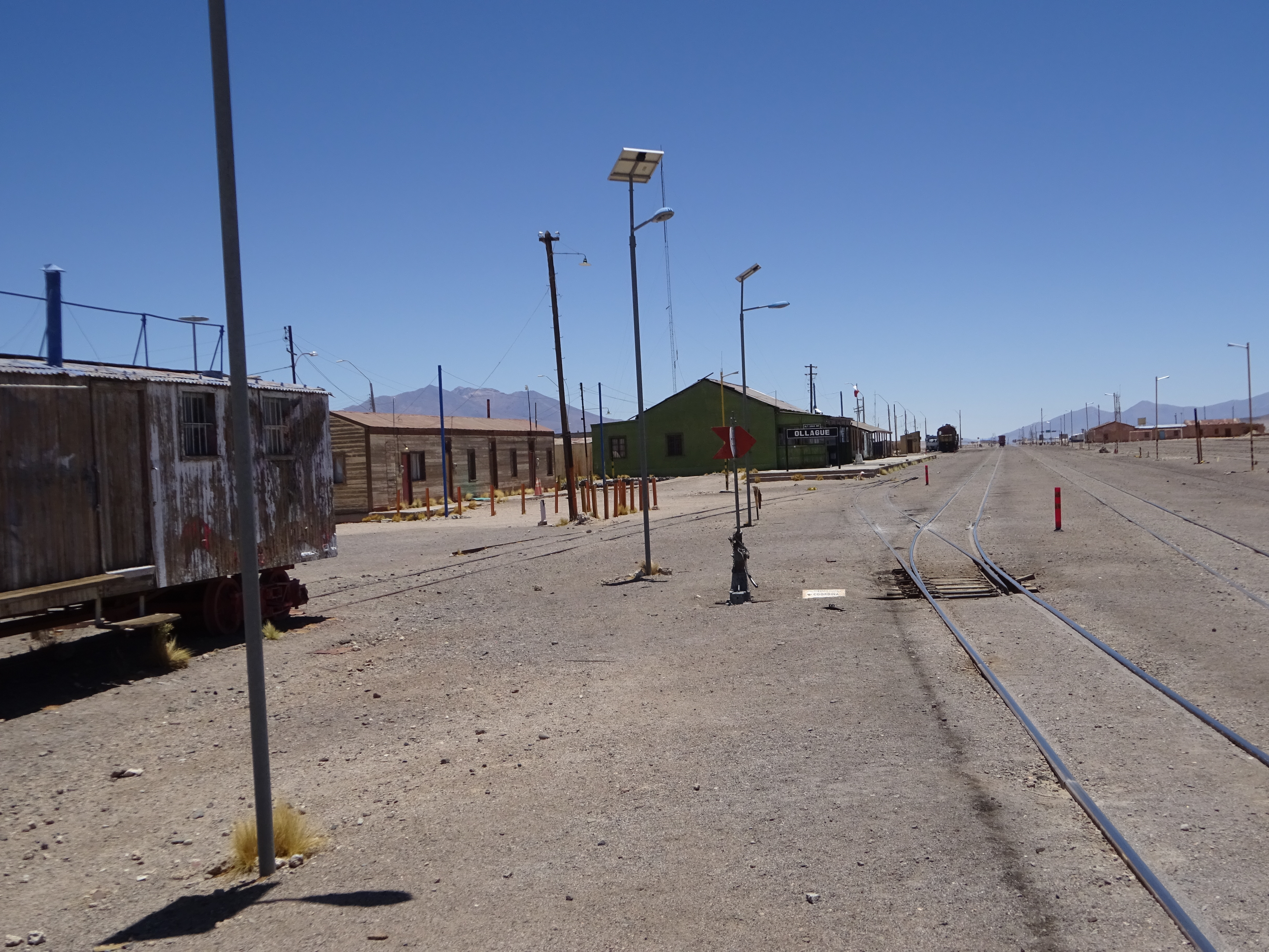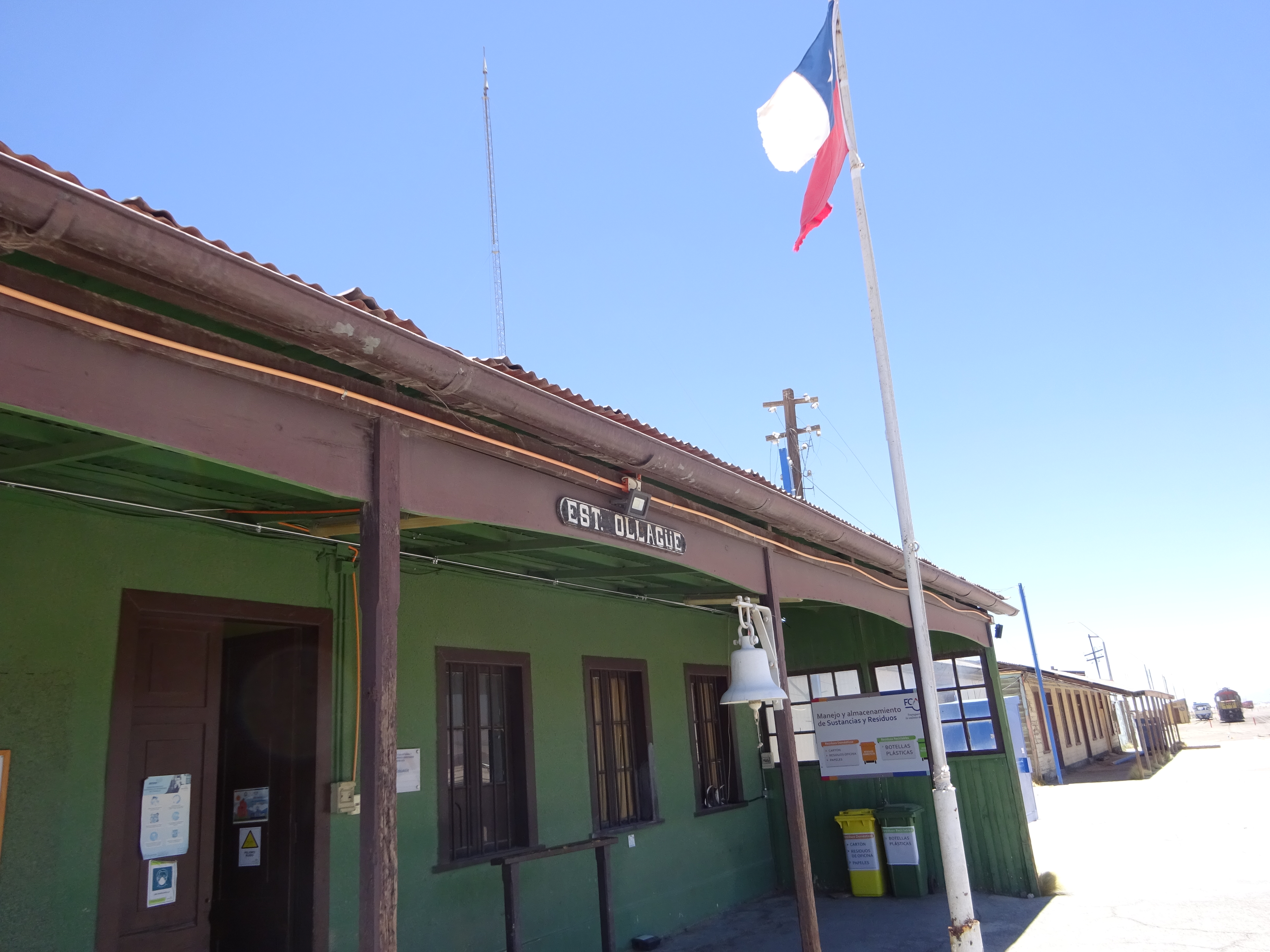 Y es así que llegamos a Ollagüe, a 3660 m. Abandonamos la vía internacional que conduce al control fronterizo pocos cientos de metros más allá y giramos a la izquierda para desviarnos al interior del pueblo. Un lugar inverosímil, surrealista. Lo más destacado es la gran estación ferroviaria, por donde transita la línea Antofagasta-Bolivia, aún en activo. Tengo la impresión de que aquí la decadencia se ha detenido, o al menos eso se intenta. Junto a construcciones ruinosas hay edificios de nueva planta, incluyendo ua rudimentaria oficina de turismo y un pabellón multiusos que sirve de centro de la vida social y cultural del pueblo, con indicaciones sobre la fauna y flora de la región. También hay ayuntamiento (la municipalidad) y una escuela.