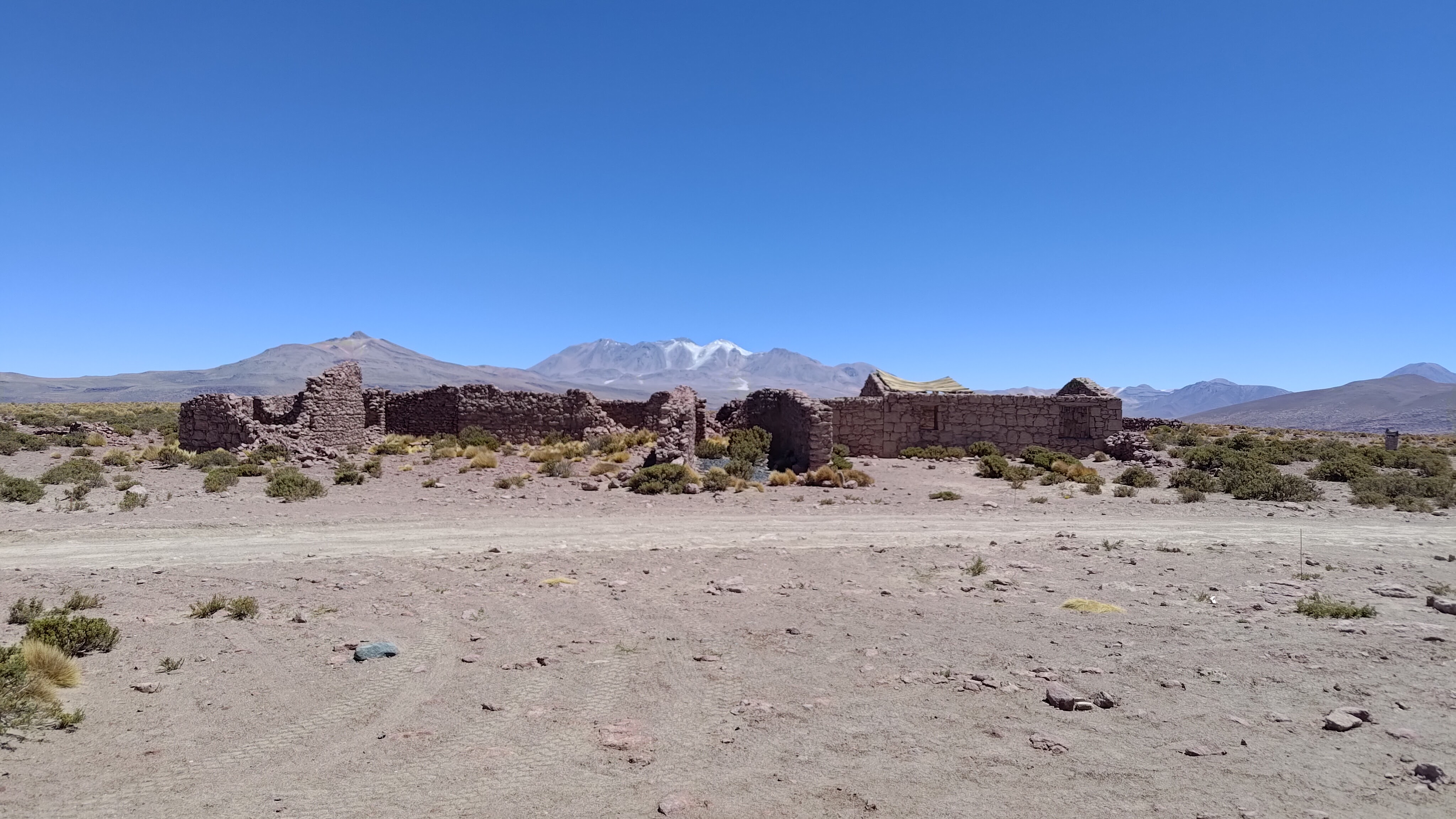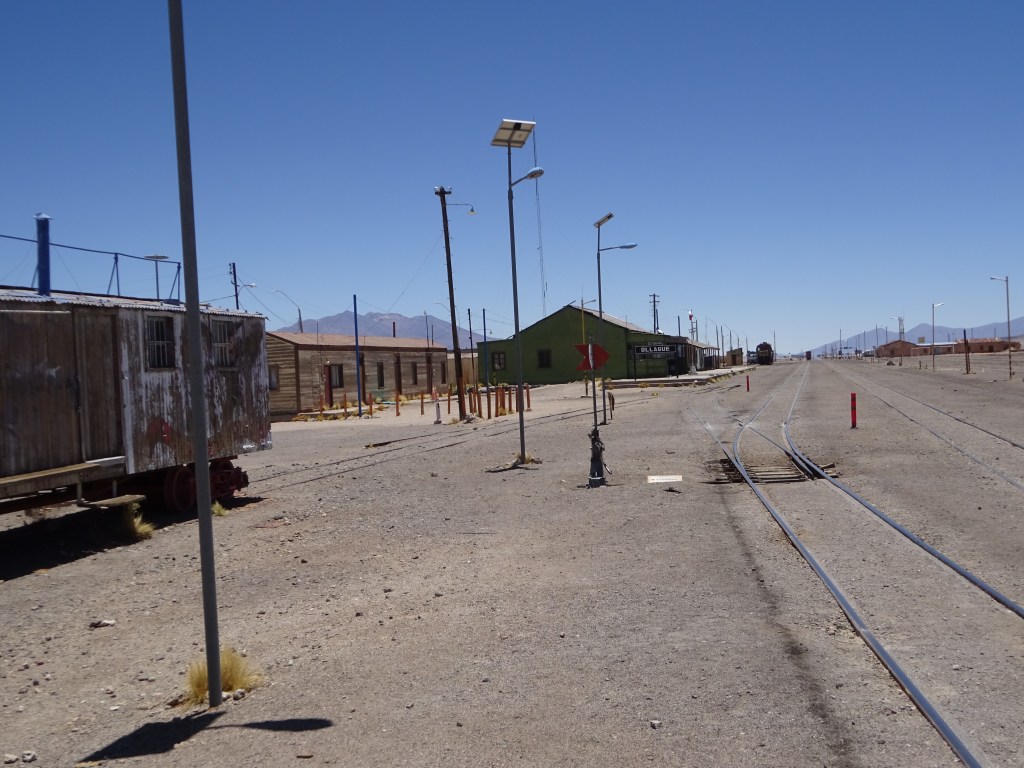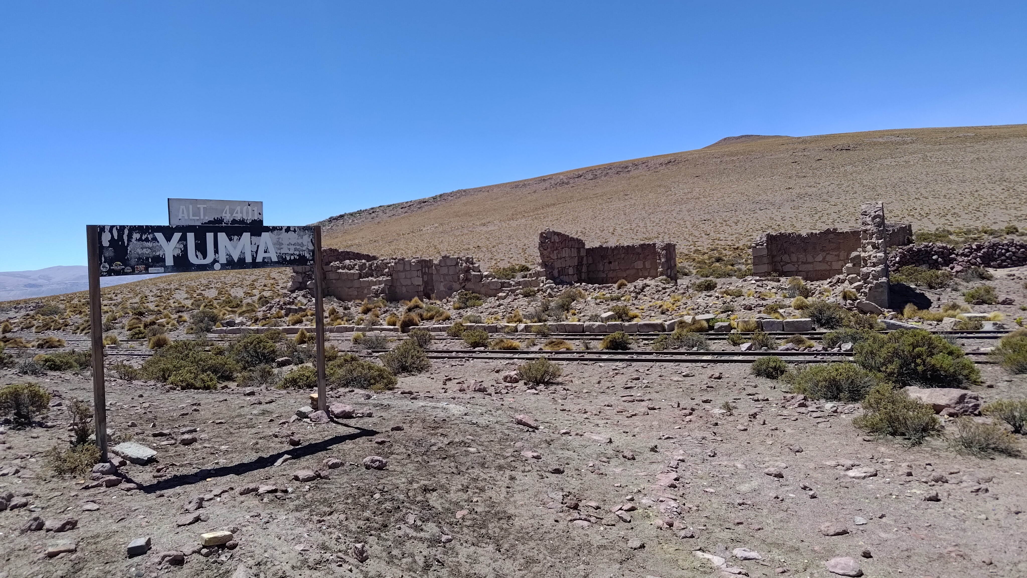 La carretera va serpenteando entre lomas, iniciamos un rodeo a media ladera de un cerro particularmente prominente, por encima de una depresión a nuestra izquierda, y he aquí que, tras una hora aproximada de camino desde Ollagüe, aparece ante nuestros ojos la Estación de Yuma. O mejor dicho, sus ruinas. Ubicadas sobre el antiguo ramal de la línea Antofagasta-Bolivia entre Ollagüe y Collahuasi, son testigos de los tiempos en que aquí se extraía el azufre que se cargaba en los trenes que partían hacia la costa. Hubo aquí actividad hasta finales del siglo pasado. Y de hecho, encontramos trabajando a una pareja de arqueólogos de una universidad del norte de Chile. Comparten con nosotros conversación y una buena ración de hojas de coca, que como es bien sabido es un buen remedio contra la fatiga derivada del mal de altura. Hay que mascarlas lentamente, como si fueran chicle, sin tragarlas.