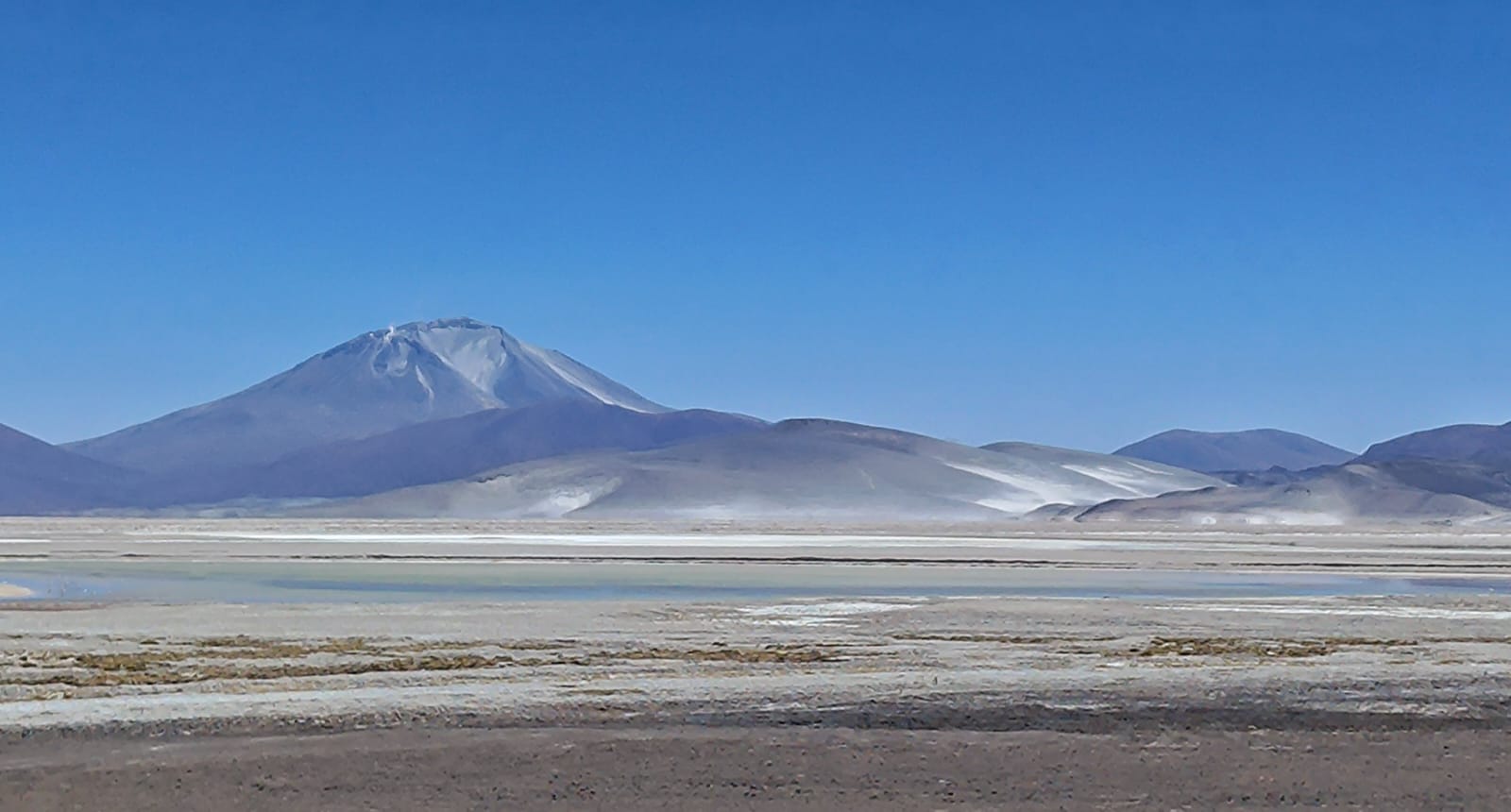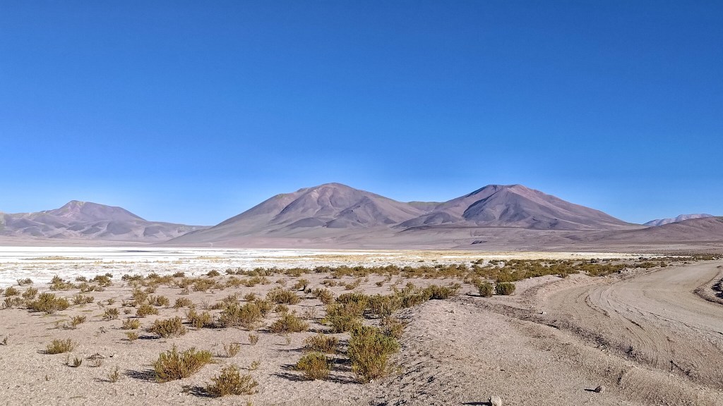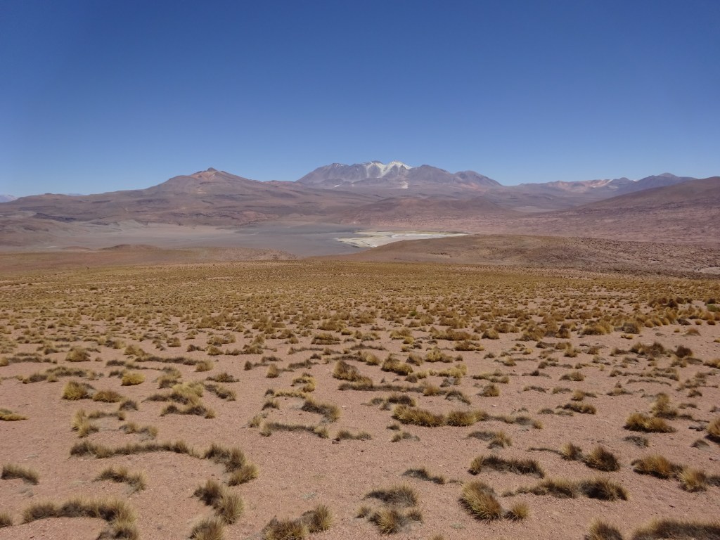 Proseguimos nuestro camino y según seguimos ganando altura la aridez disminuye algo y hace su aparición la vegetación herbácea xerófila típica del altiplano. A casi 4000 m de cota, y tras unos 150 km de conducción, damos vista al gran salar de Ascotán. El primero de muchos que encontraremos en este viaje.