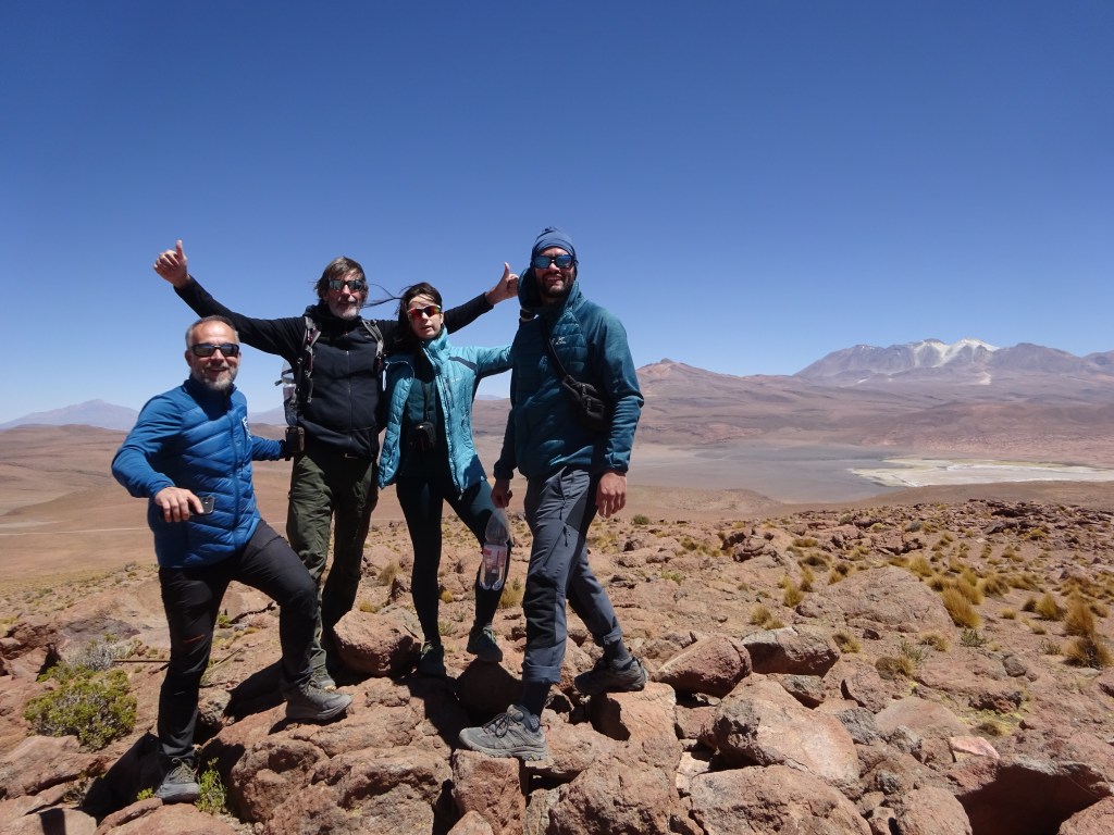 4400 metros, en Europa esto sería como la cumbre del Cervino. Y aunque la idea de hoy era aclimatar haciendo turismo, la cabra tira al monte. ¡Ay!, esa loma de aspecto fácil justo al norte… Se la ve ahí mismo. Tomamos la decisión en un instante y salimos escopeteados como búfalos. La pendiente es suave y el terreno, de gravilla fina, salpicado de matas de paja brava. No hay un sendero definido, se puede pasar por cualquier parte, navegando a vista hacia la cima. De todas formas, se acaba haciendo duro; la única dificultad de esta montaña es la altitud, y la facilidad con que se alcanza el punto de partida. La falta de aclimatación se hace notar, y dos personas del equipo lo pasan bastante mal. Una se da la vuelta, mientras que la otra, aquejada de mareos, tiene que tumbarse y poner piernas en alto durante un par de minutos. Afortunadamente se recupera y puede proseguir. La cumbre consiste en un airoso mogote de roca que no opone gran dificultad, siendo más sencillo atacarla por la derecha. Y finalmente llegamos, estamos a 4607 m de altura, en la primera montaña de nuestra expedición. Hemos tardado 43 minutos desde el coche para hacer 203 m de desnivel en 1,85 km, lo que no está nada mal. El panorama es hermoso, inhóspito. Las montañas más cercanas son relativamente modestas, hacia el norte intuyo ya el complejo minero de Collahuasi, hacia el oeste las quebradas que descienden hacia el valle central y la civilización. Inevitablemente, el Aucanquilcha sigue atrayendo las miradas, y de su vista podremos gozar ininterrumpidamente durante el descenso.