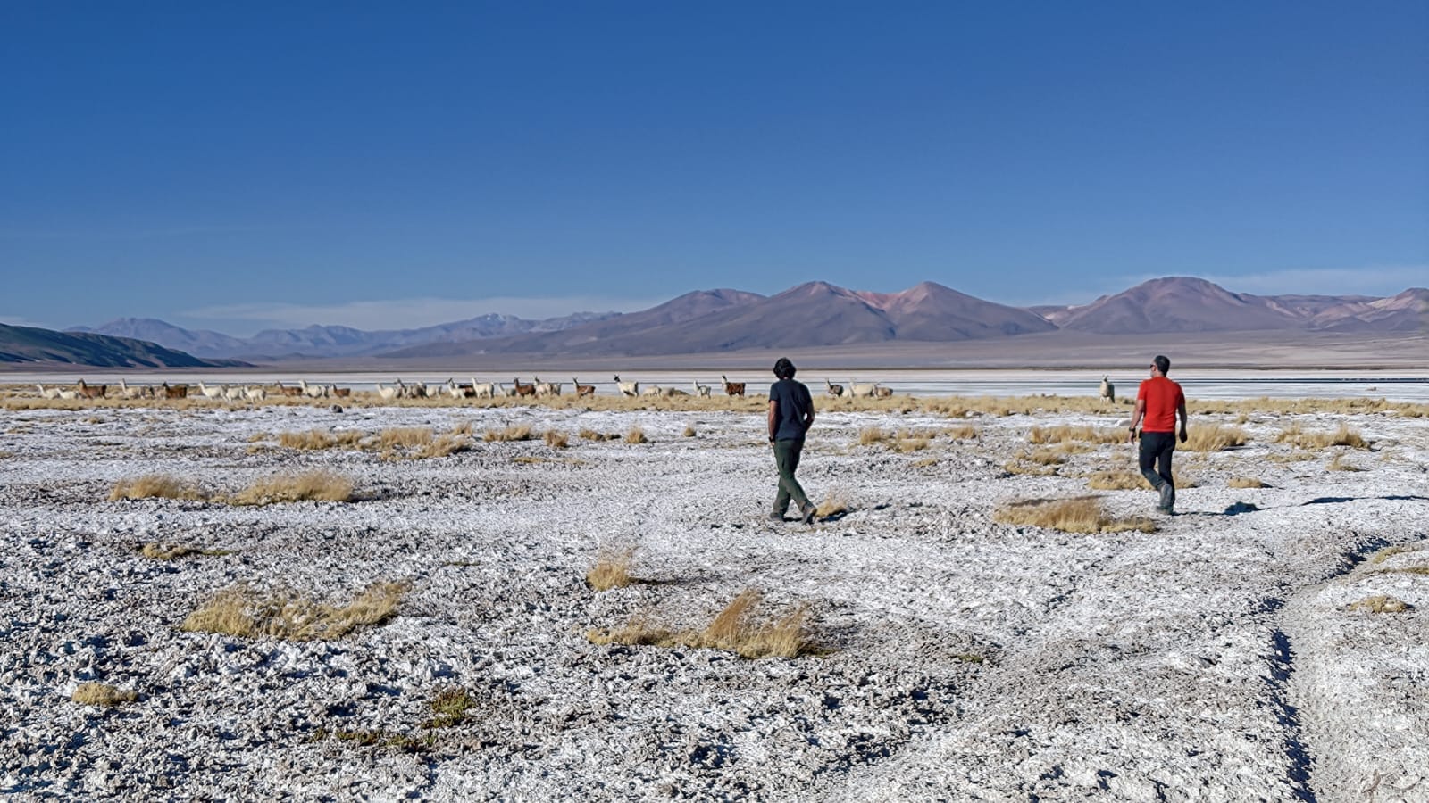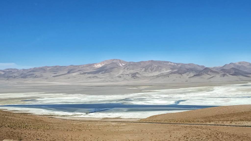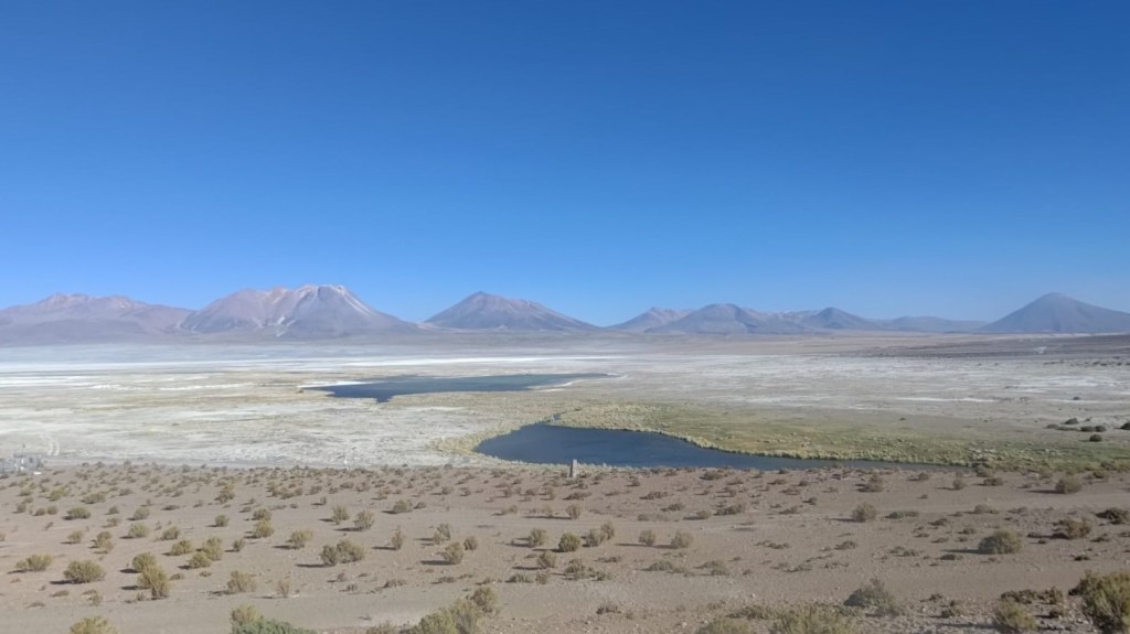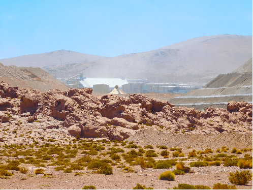La dificultad para liberar la rueda de repuesto nos complica la vida, pero finalmente nos las apañamos. Tenemos tiempo de conversar con el guardia sobre la vida en la mina y su impacto ambiental. Cuenta que los atropellos de vicuñas, una especie protegida que hace no tanto estuvo seriamente amenazada, llegaron a hacerse tan frecuentes que se tomó la decisión de que cualquier empleado de la mina que matara una de ellas sería inmediatamente despedido, amén de pagar una multa de varios miles de dólares. Esta mina es casi una ciudad en el altiplano, y sus instalaciones alteran el paisaje de forma dramática. Peor aún, consume y contamina la escasísima y valiosa agua que alimenta los salares y constituye la reserva vital de los habitantes de la región. Esta es la cara oscura de la revolución verde que presuntamente salvará el planeta, y de paso enriquecerá generosamente a los sospechosos habituales. El cobre y el litio de las baterías que sustituirán el petróleo se obtienen desgarrando las entrañas del planeta del que tanto dicen preocuparse ahora quienes más han contribuido, y siguen contribuyendo, a degradar.