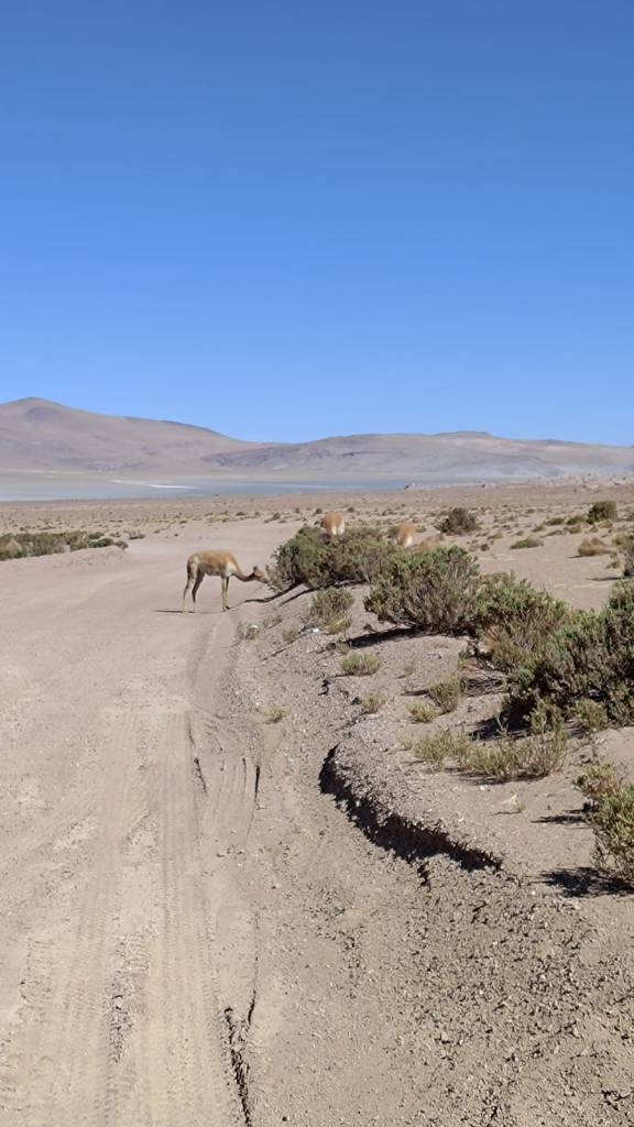 Descendemos y vamos bordeando la gran extensión de sal durante varios kilómetros. Por aquí pasa el vetusto tren minero, hay un poblado e instalaciones para la explotación de la sal. Aquí avistamos también las primeras vicuñas. Un segundo salar, esta vez a la izquierda de la carretera, el de Carcote, anuncia la proximidad de la localidad de Ollagüe.