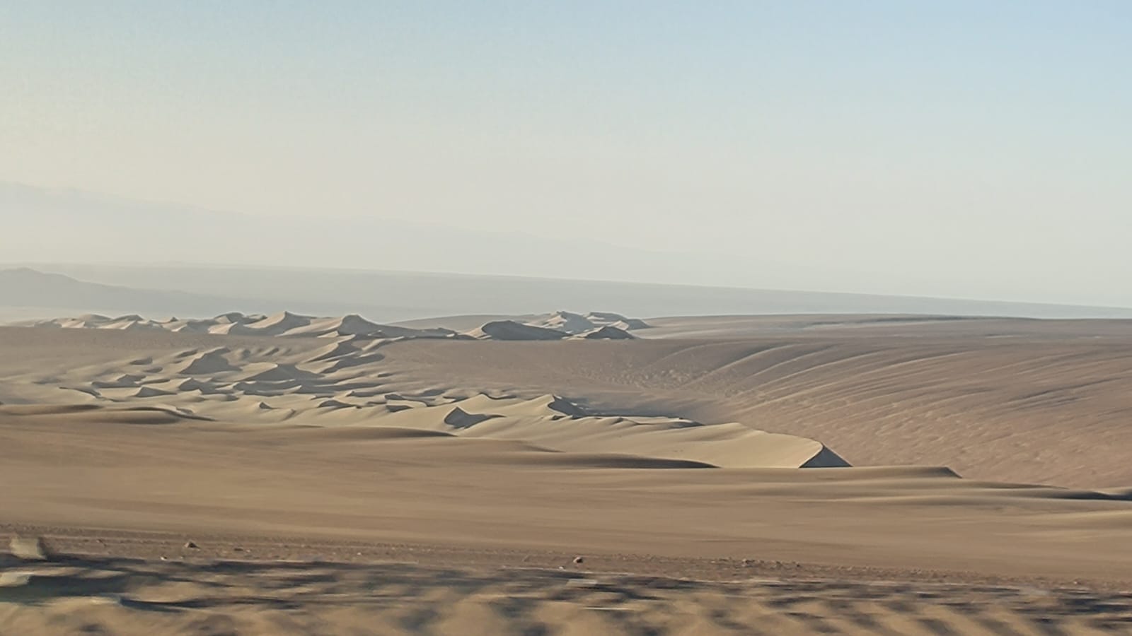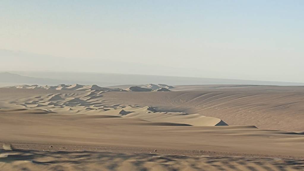 Alcanzamos entonces el cruce con la mencionada carretera… que abandonamos de inmediato para seguir un nuevo camino sin asfaltar que emprende finalmente el descenso hacia Pica. Los primeros kilómetros exigen un poco de atención, hay tramos con piedra suelta. Más tarde reaparece el asfalto, y la pendiente aumenta. A ratos la arena invade la vía y amanaza la adherencia de los neumáticos. La pérdida de altitud significa que regresamos a la aridez más absoluta.