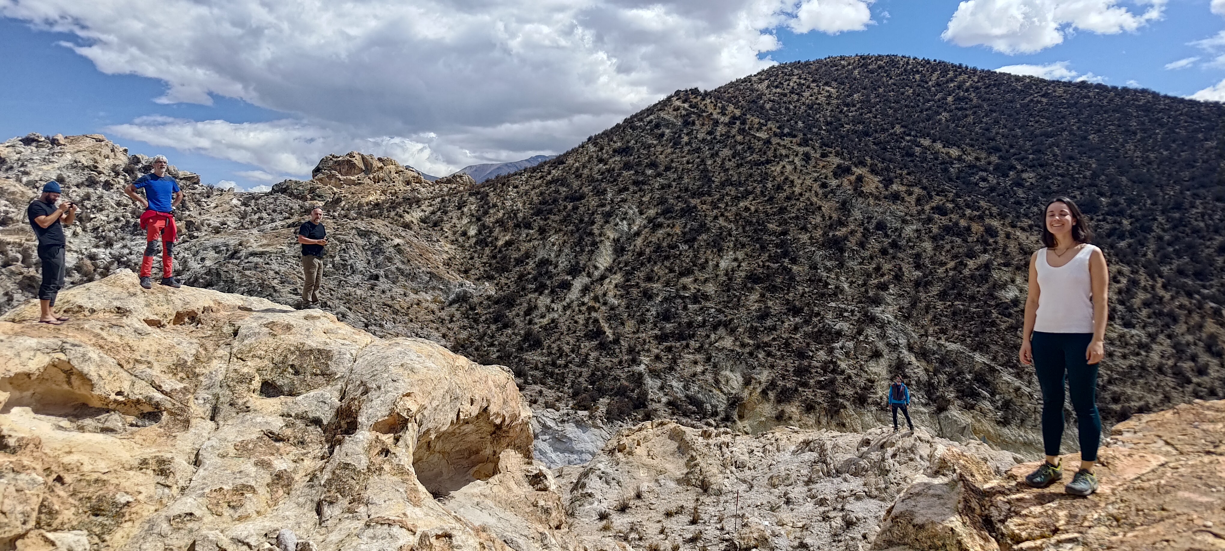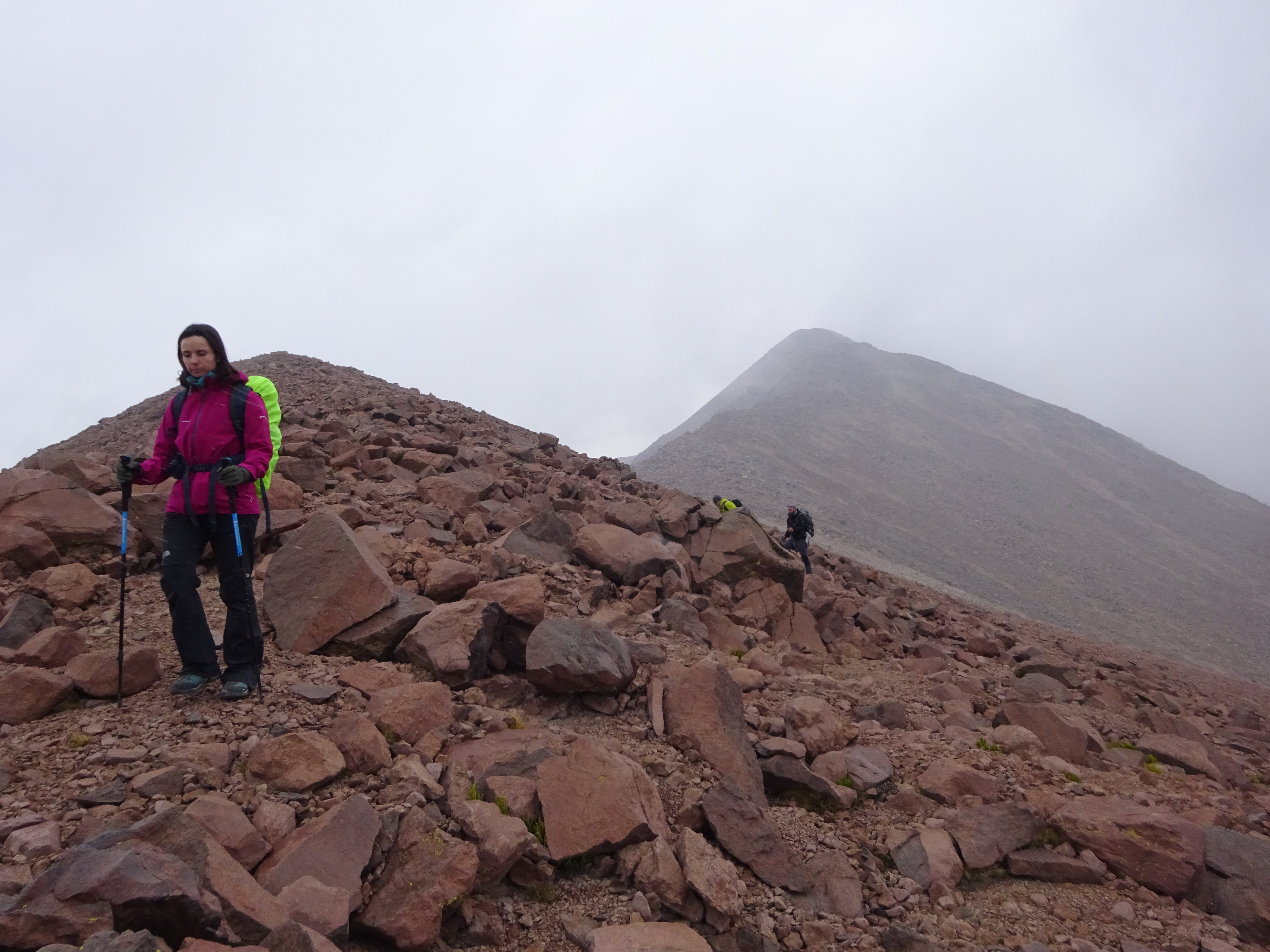 Continuamos siempre buscando trazas de sendero y algún hito disperso, pero no hay problemas de orientación. Siempre avanzando en dirección al collado a la izquierda del acantilado salvamos un primer escalón donde afloran algunas rocas. Algo más allá, según vamos llegando al pie de la escarpadura, el terreno se complica, penetrando en una amplia pedrera que dificulta la progresión. Observo que Marie empieza a sufrir, quedándose rezagada. No parece nada grave, pero me da miedo que flojee y lo pase mal. Es probablemente la persona más emocionada con este viaje, se ha preparado a conciencia y desborda ilusión.