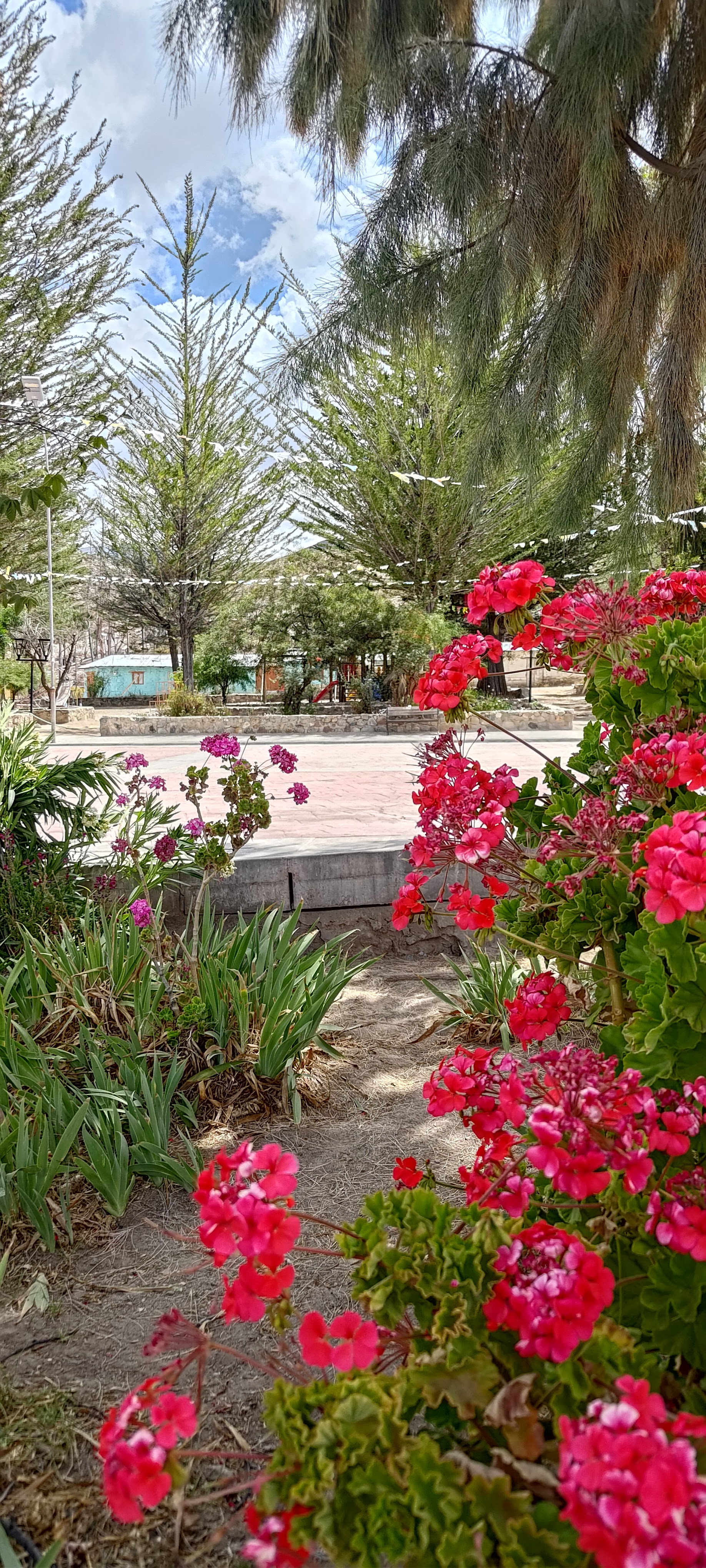 En el interior se está celebrando algún tipo de acto social. Preguntamos a una señora, que tras un par de llamadas nos dirige a un comedor situado a unos cien metros. Es el lugar donde preparan los almuerzos para los trabajadores de las obras en la carretera 11-CH. La encargada está muy atareada. Nos dice que volvamos para la una. Lo cual supone esperar más de una hora, pero no tenemos alternativa. Así que tras el paseo (breve) por la localidad, nos sentamos en un parque, a la sombra. Está bien cuidado, limpio, acogedor.