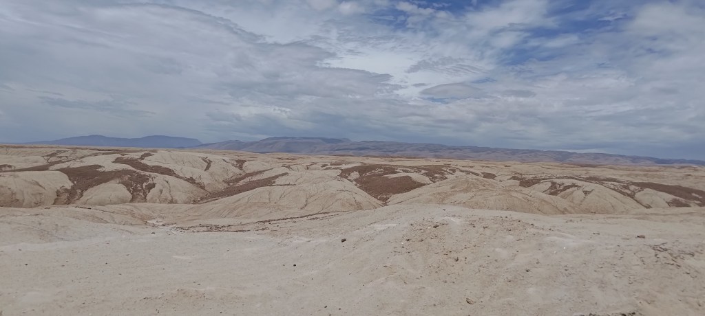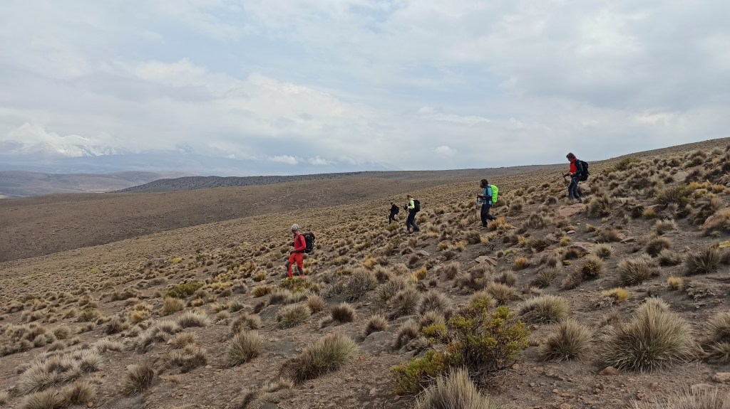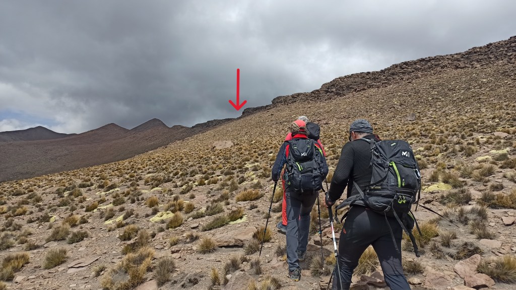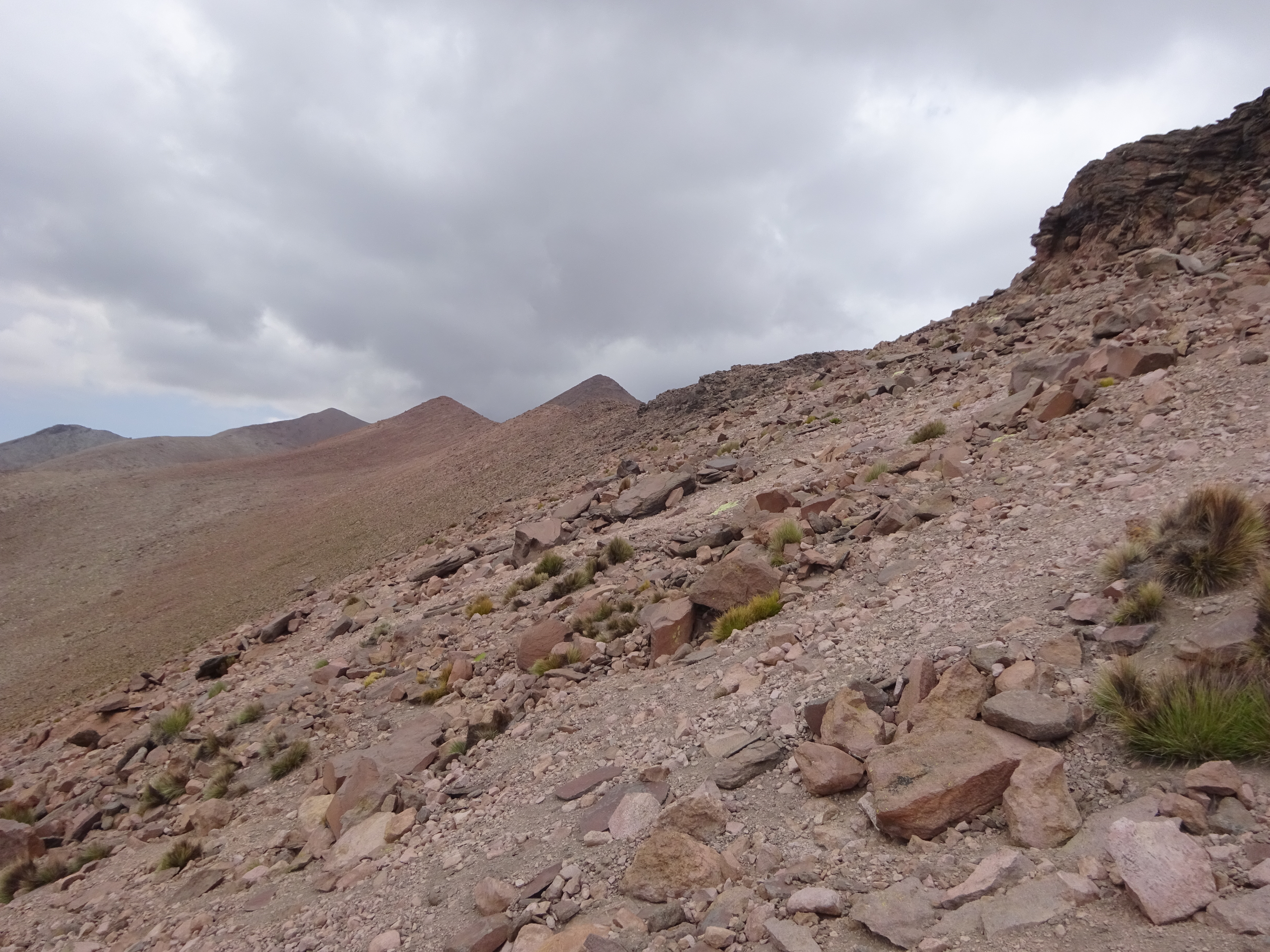 La reseña de la página Andeshandbook indica que hay que seguir una línea de postes eléctricos para ir a alcanzar una explanada sobre una ancha arista que se desprende de la escarpadura que tenemos delante y a nuestra izquierda. El terreno es sencillo, de arenas y gravas finas que permiten una buena tracción, salpicado de matas de paja brava. No hay un camino marcado como tal, así que subimos a vista, y pronto me parece evidente que no hay ninguna necesidad de continuar rectos para llegar hasta la arista. Se trata de un rodeo innecesario, así que nos olvidamos de los postes y vamos girando poco a poco hacia la izquierda, tomando como referencia el collado en la cresta hacia la que nos dirigimos.