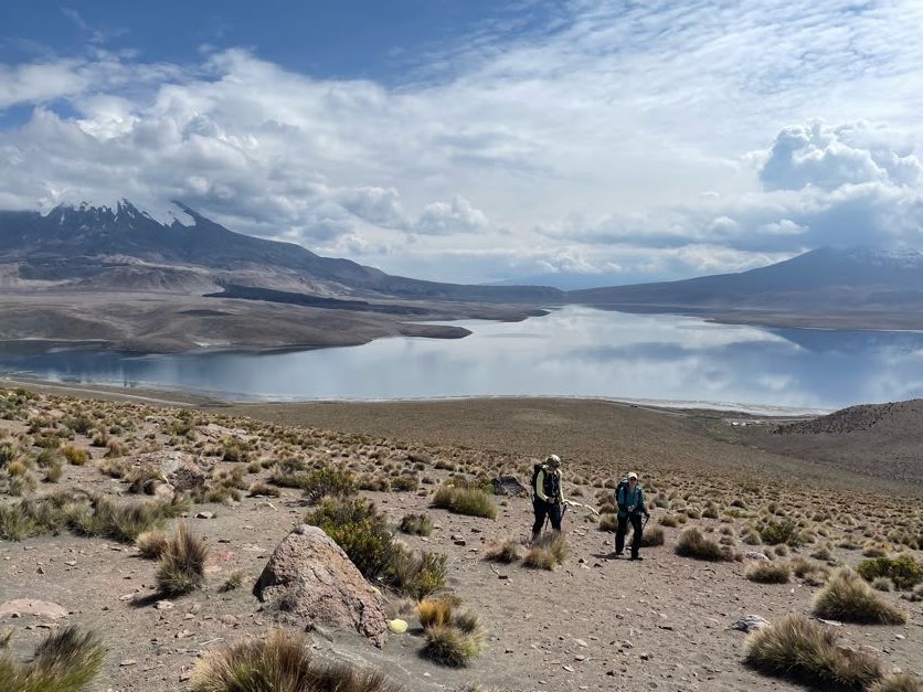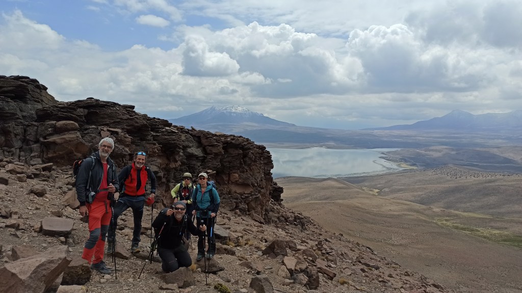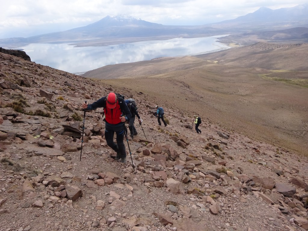 La pendiente es moderada, pero la altitud se percibe en el organismo. Nos tomamos un respiro para disfrutar de las vistas hacia el Norte, magníficas. He estado aquí antes arias veces. El cono níveo del Parinacota, ahora envuelto por las nubes, es siempre cautivador. Atrae irresistiblemente la mirada. Somos afortunados de estar aquí, y me siento contento de poder compartir estos momentos con mis compañeros.
