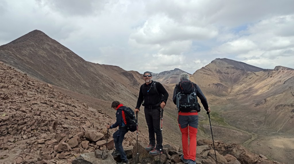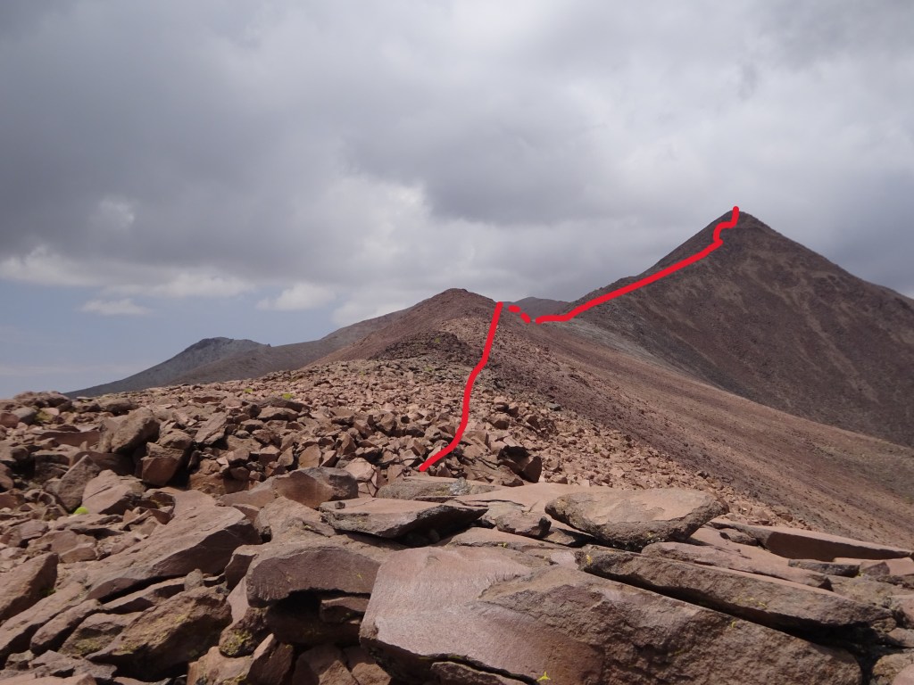 Frente a nosotros tenemos la pedregosa cresta que recorreremos. Debemos dirigirnos hacia un modesto promontorio, descender a un segundo collado, y desde ahí seguir la arista que, con pendiente fuerte y sostenida, nos conducirá a la cima.