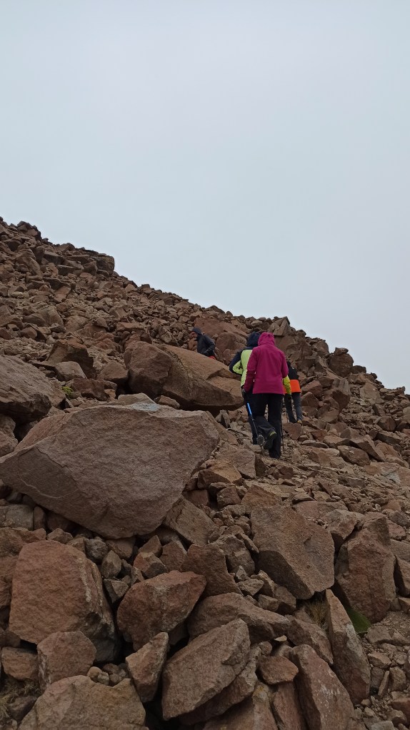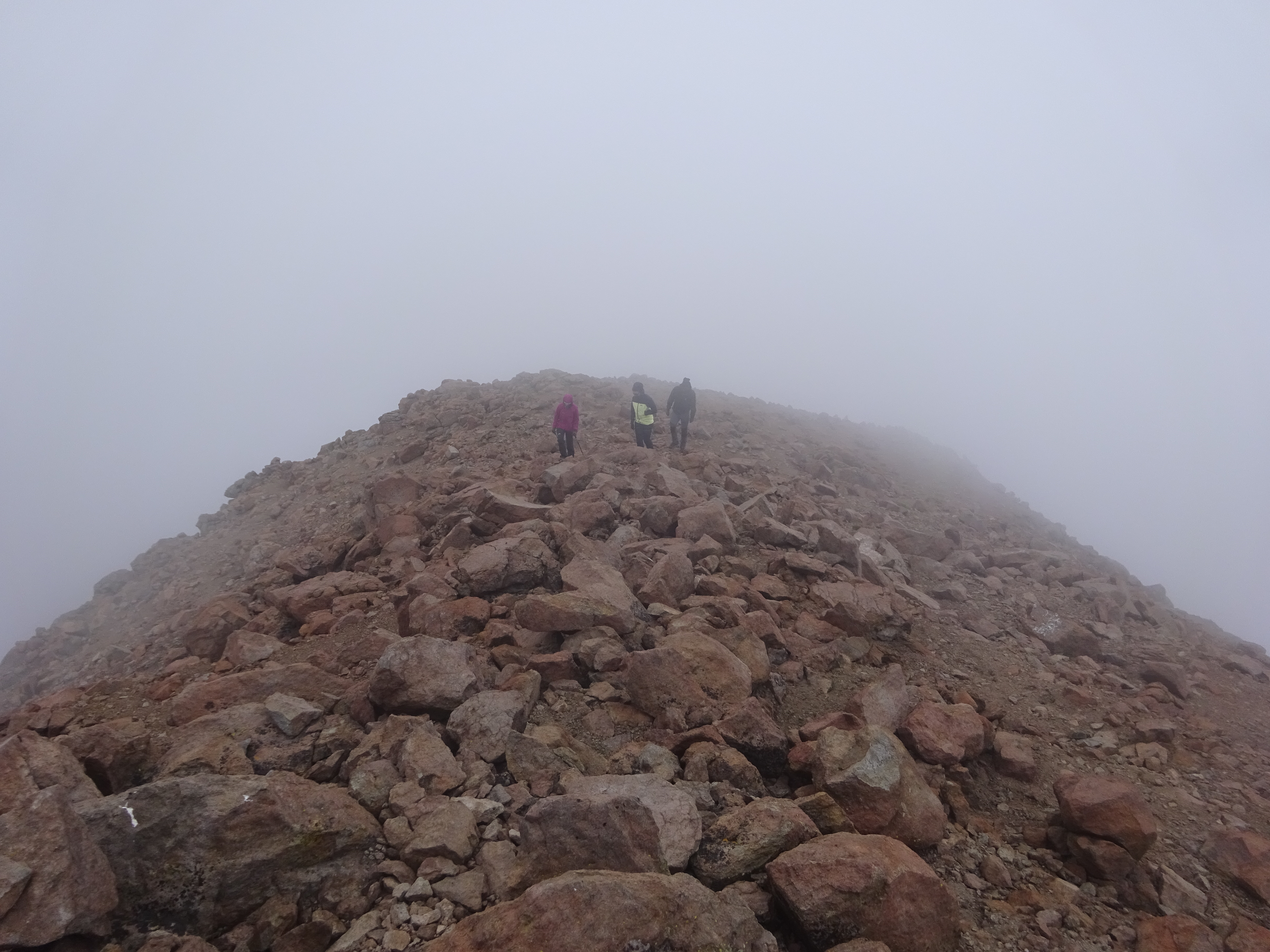 Decidimos dejar aquí las mochilas y subir así más veloces. Nos movemos entre grandes bloques, con tendencia hacia la izquierda. La niebla nos envuelve. Hasta que ya no podemos subir más… Un gran hito nos confirma que hemos alcanzado la cima. Son las dos menos cinco y hemos tardado apenas diez minutos.