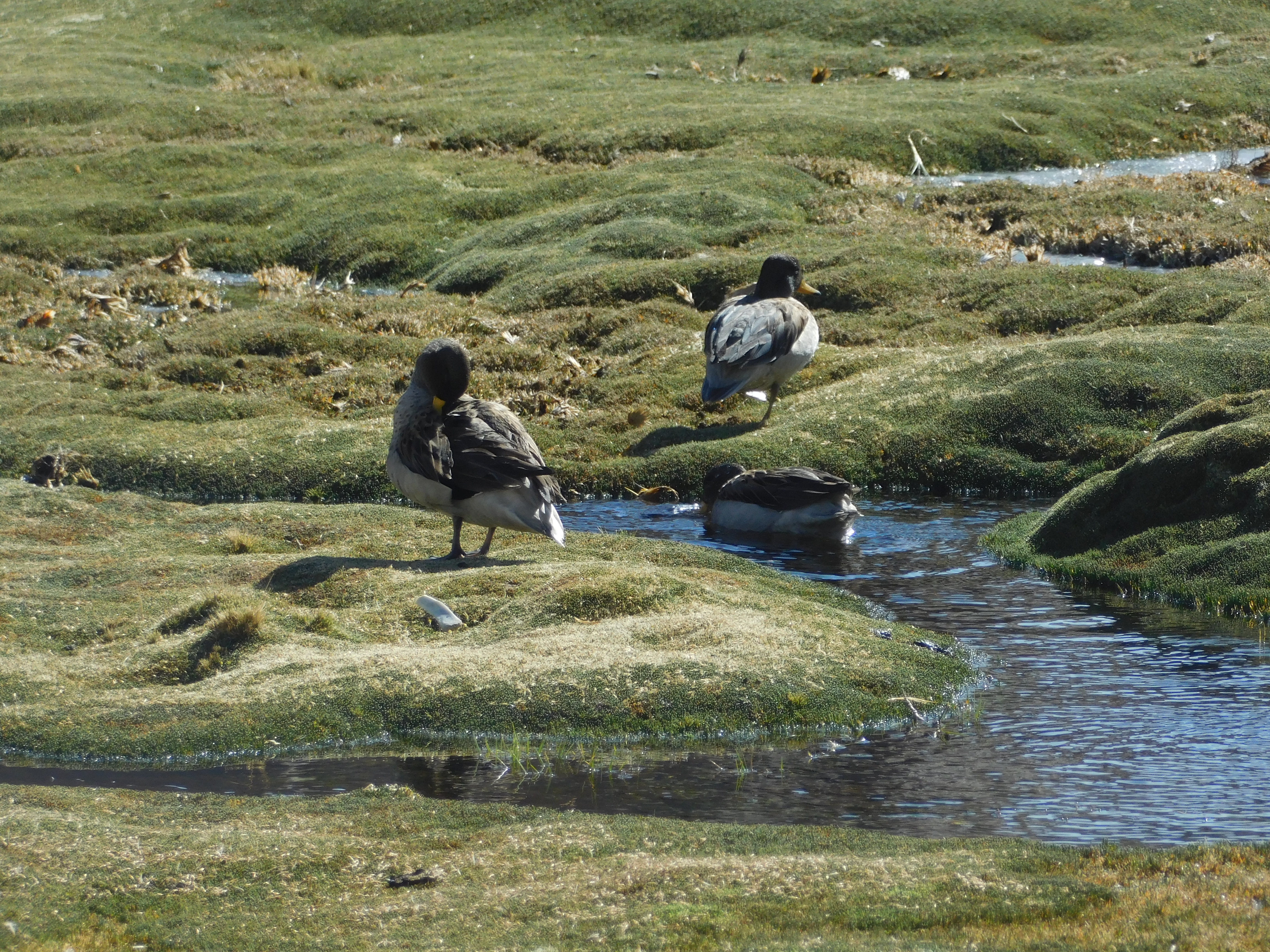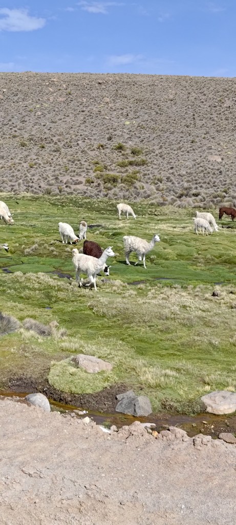 Echamos a andar sobre las diez y cuarto de la mañana, conscientes de que esta será la última vez que nos podamos permitir partir a semejantes horas. Nos sentimos optimistas. De inmediato nos metemos en e bofedal donde pastan las alpacas, viendo de atravesarlo sin mojarnos los pies y así empezar a remontar la ladera que tenemos frente a nosotros.