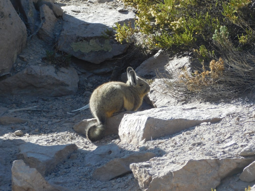 Desayunamos temprano y partimos en nuestros coches en dirección Bolivia. Dejamos a la derecha el desvío hacia la Termas de Jurasi y algunos kilómetros más adelante, el área de Las Cuevas. Este es un paraje del Parque Lauca, ubicado junto a la carretera, de gran valor naturalístico. Un amplio bofedal, surcado por pasarelas peatonales que permiten visitarlo cómodamente. Aquí se aloja una nutrida colona de vizcachas, simpáticos roedores del tamaño de una liebre. Hay también un pequeño baño termal.