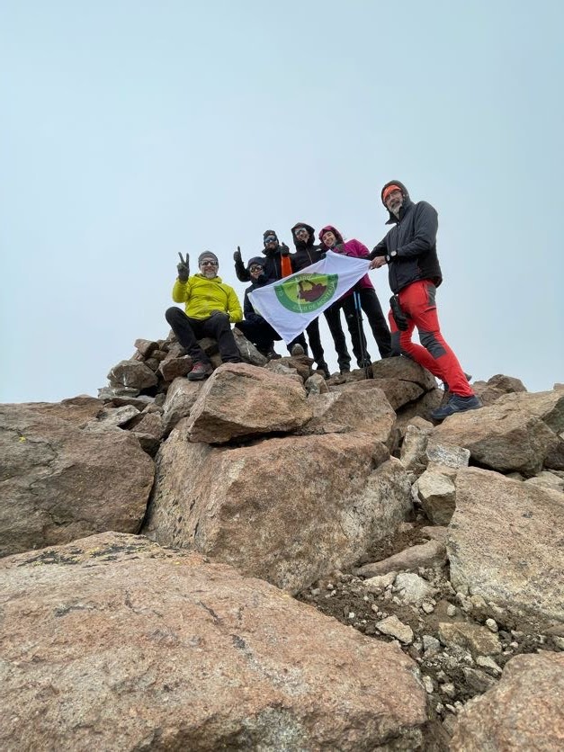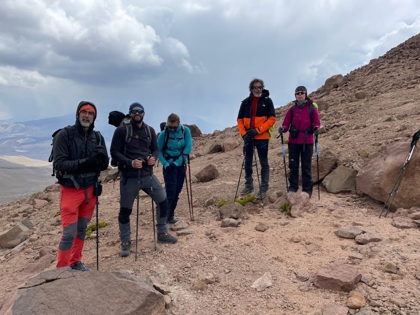 Xavi y yo gritamos la buena noticia a nuestros compañeros. 5350 metros, se dice pronto, ¡qué pasada!. Más alto que el Ararat, al que alguno de los nuestros renunció para venir aquí, y mucho más que el Mont Blanc. En cuanto llega el resto nos abrazamos todos y hacemos la foto de rigor. Y inmediatamente después, echar a correr de vuelta. Hoy no es día para recrearse aquí arriba.
