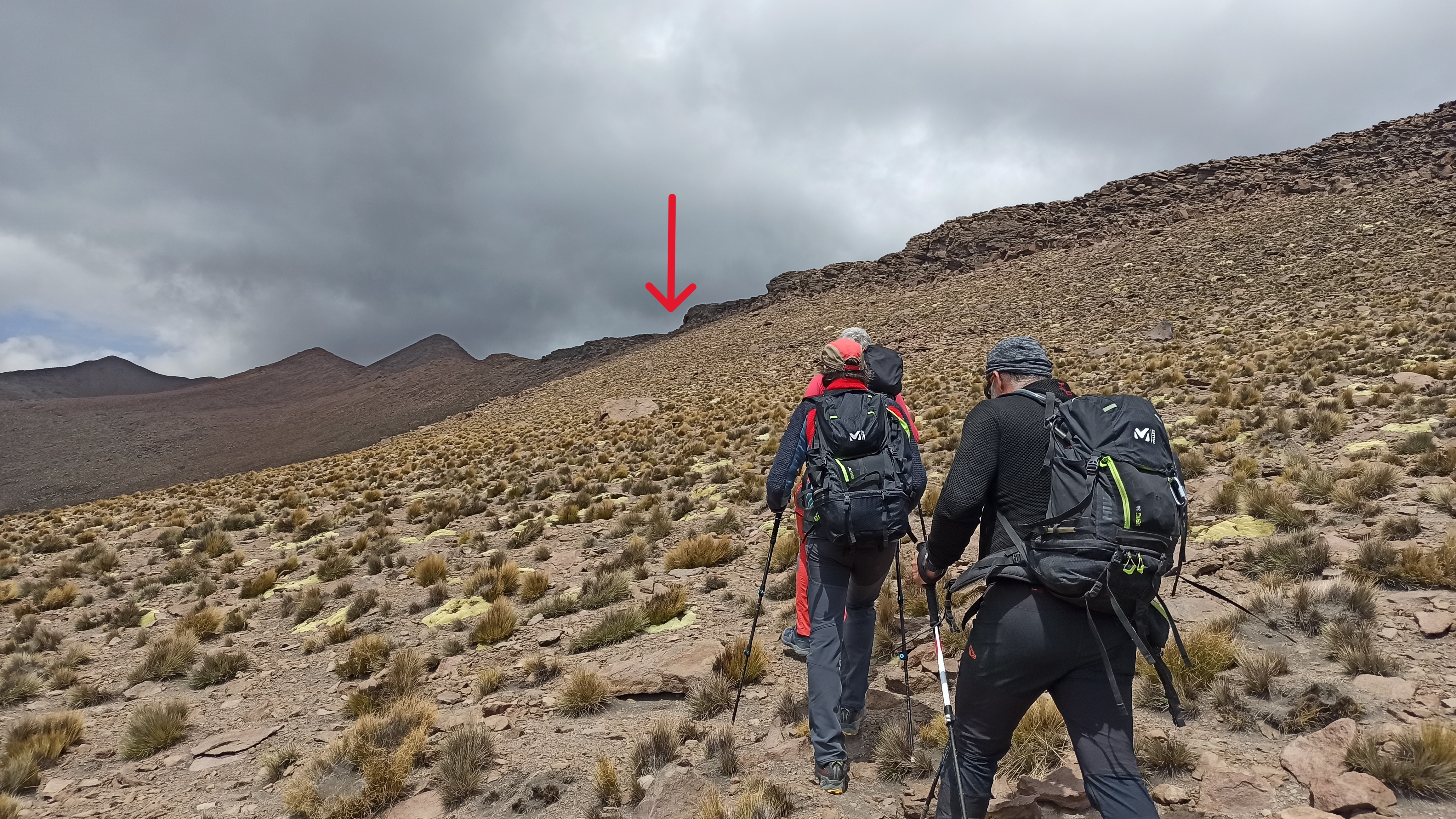 Hacia arriba, ¡no hay tiempo que perder! A partir de este punto la pendiente vuelve a ser fuerte, pero el sendero está bastante marcado, con algunos hitos. En algunos puntos pequeños saltos rocosos requieren algo de atención, pero sin oponer dificultades técnicas dignas de este nombre. Me siento bien, en forma, lo que unido a la ansiead por la tormenta me hace acelerar. Marie se queda atrás y… empezamos a escuchar truenos inquietantemente próximos. Hay relámpagos sobre Tambo Quemado y las inmediaciones del Guallatiri. Ya sabíamos que el invierno altiplánico estaba llegando, y hemos además hemos salido bastante tarde. Alcanzamos una cómoda repisa a unos 5250 m donde nos quitamos las mochilas y esperamos que Marie llegue. Hay que tomar una decisión.