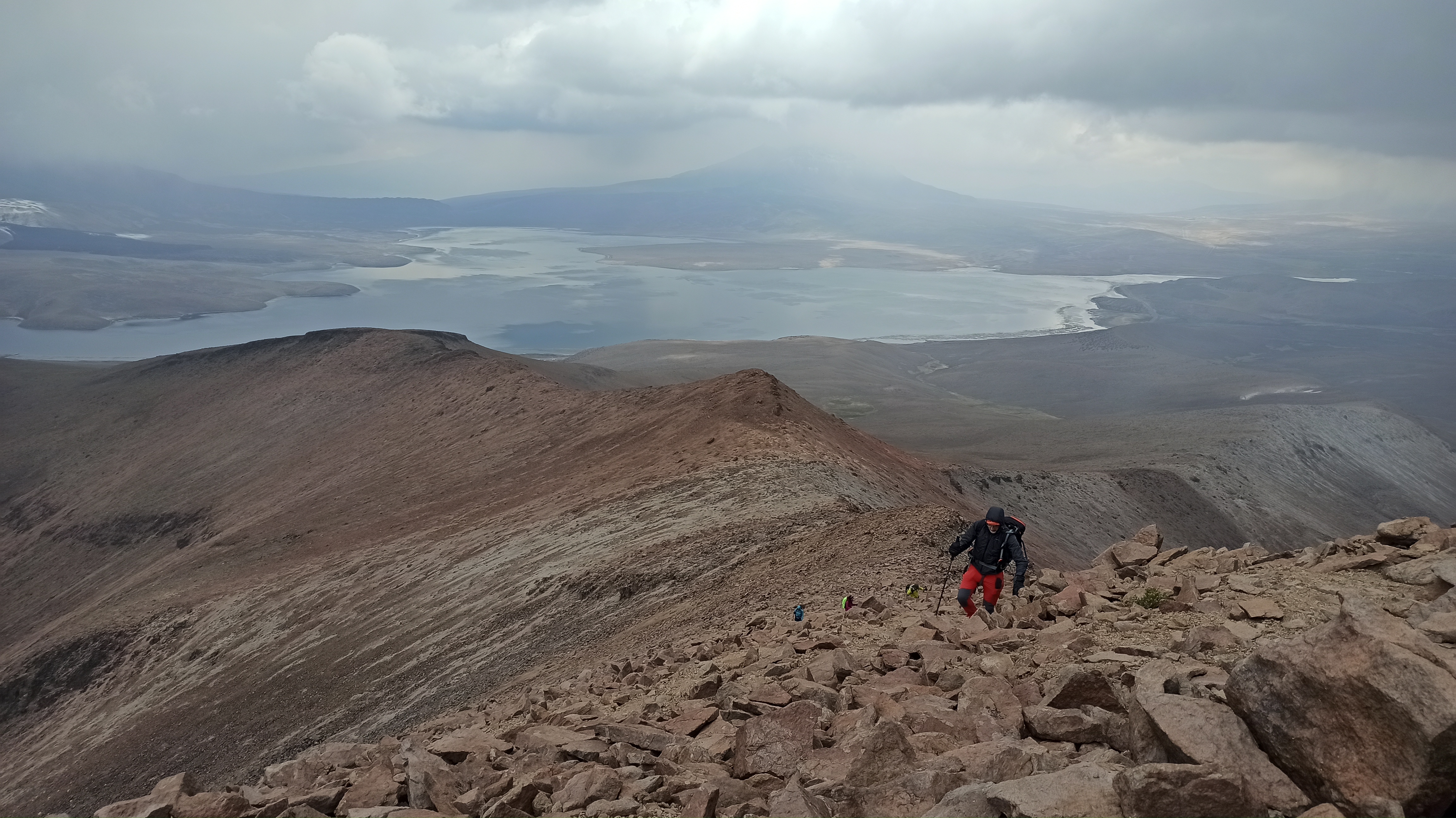 Un breve descenso nos conduce al segundo collado al pie de la arista terminal, donde esperamos a los rezagados y nos reagrupamos. Estamos a unos 5130 m de altura, a sólo 200 m de desnivel de nuestro objetivo, pero la posibilidad de que una tormenta tropical se nos eche encima se acrecienta cada minuto que pasa. Ya han empezado a caer algunas gotas de lluvia.