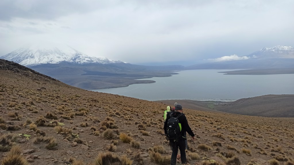No nos demoramos demasiado, no vaya a ser que vuelvan los truenos. Comenzamos a descender más o menos por donde subimos, pero enseguida decidimos atajar en línea recta, por la línea de máxima pendiente. El terreno arenoso nos permite incluso correr, una verdadera gozada. Sólo nos detenemos para gozar de la visión del Parinacota y el Lago Chungará con los colores de la lluvia. Hay algo épico en todo esto.