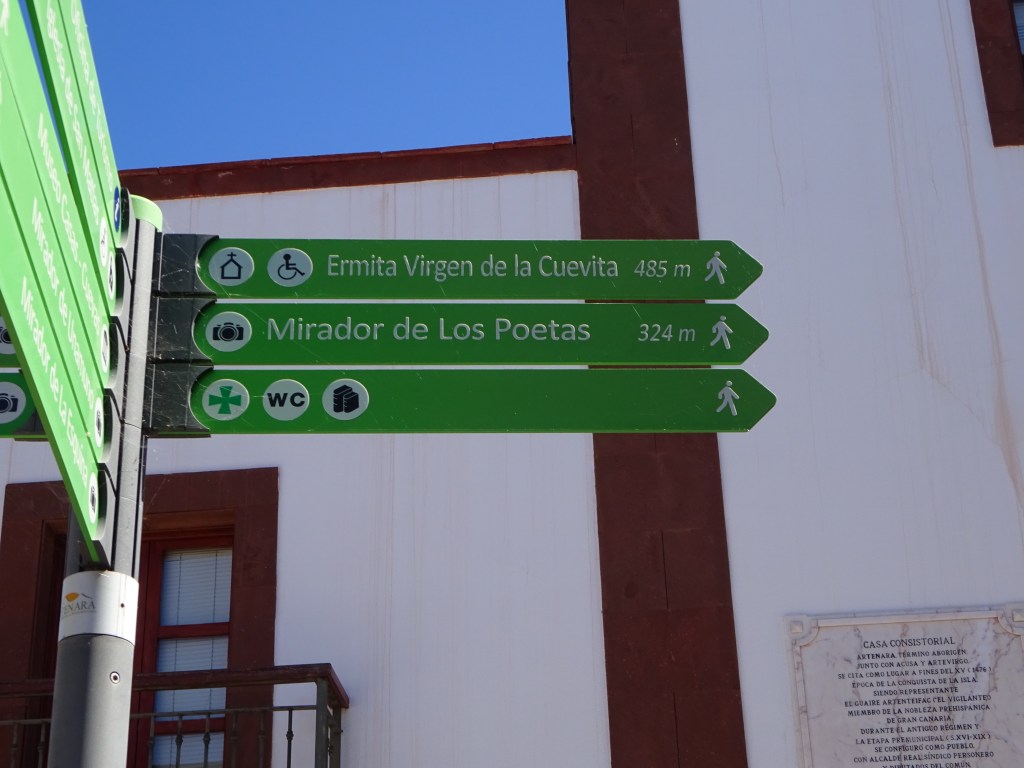 La mañana de finales de abril es un lujo, de terso cielo azul y temperatura perfecta. El objetivo es la modesta cumbre de la Montaña de Artenara, la primera del cordal que culmina en los 1772 m del Cerro Moriscos, sobre el turístico Mirador de la Degollada de las Palomas. Echamos a andar por la calle que sube desde la plaza en dirección a la Ermita de la Cuevita, perfectamente señalizada. También es posible empezar desde el cercano Mirador de Unamuno, usando las escaleras que enlazan un poco más arriba.