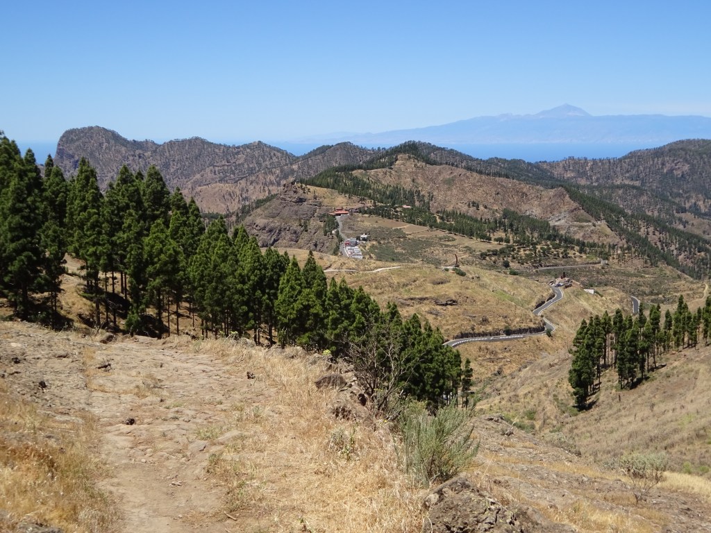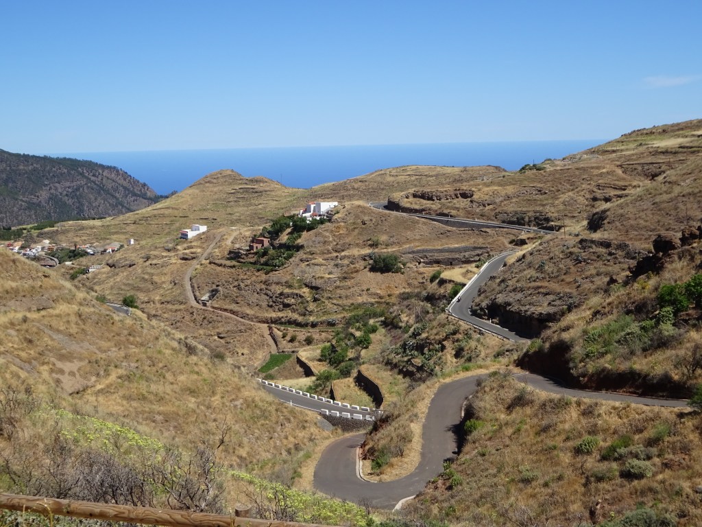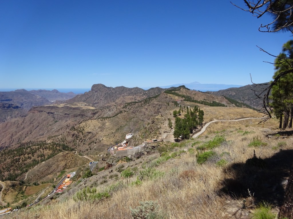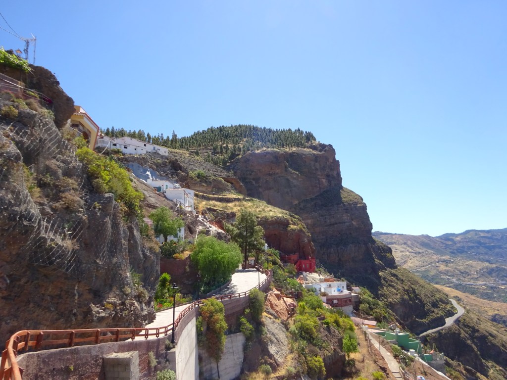 La calle asfaltada sube bordeando el risco. A la derecha amplios panoramas sobre los roques del centro de la isla, el Bentayga y el archifamoso Roque Nublo.