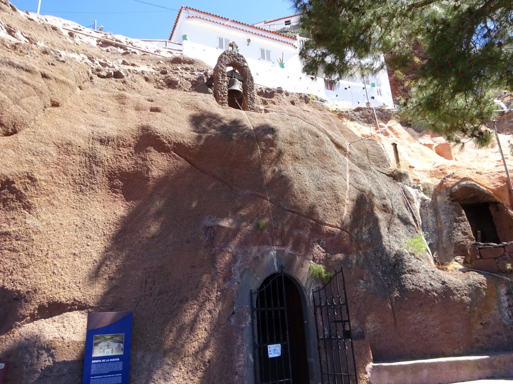 Pronto llegamos a la ermita. Se trata de una iglesia rupestre. Este pueblo tiene cierta fama por sus casas-cueva, excavadas en las paredes rocosas de la Montaña de Artenara. Algunas de ellas han sido convertidas en alojamientos turísticos llenos de encanto.