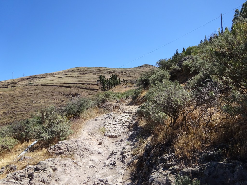Deshacemos durante algunos cientos de metros el camino de la ida hasta dar con la pista donde desembocan las escaleras de la Cuevita, en poco menos de media hora desde la cima. En esta ocasión progresaremos por la pista que rodea por detrás la loma bajo la que se asienta Artenara.