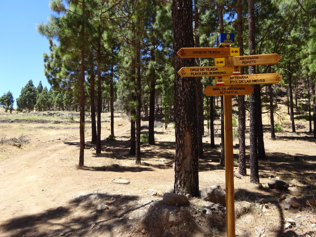 Cuando volvemos a encontrarnos de frente el azul del cielo sabemos que ya estamos llegando. Y ahí está, un nuevo poste señalético en una encrucijada de caminos. Nosotros abandonaremos el sendero balizado para girar a la izquierda en suave ascenso. La lama indica «Montaña de Artenara 1458 m». Esta es la cota que aparece en algunos mapas, pero no corresponde a la de la cumbre.