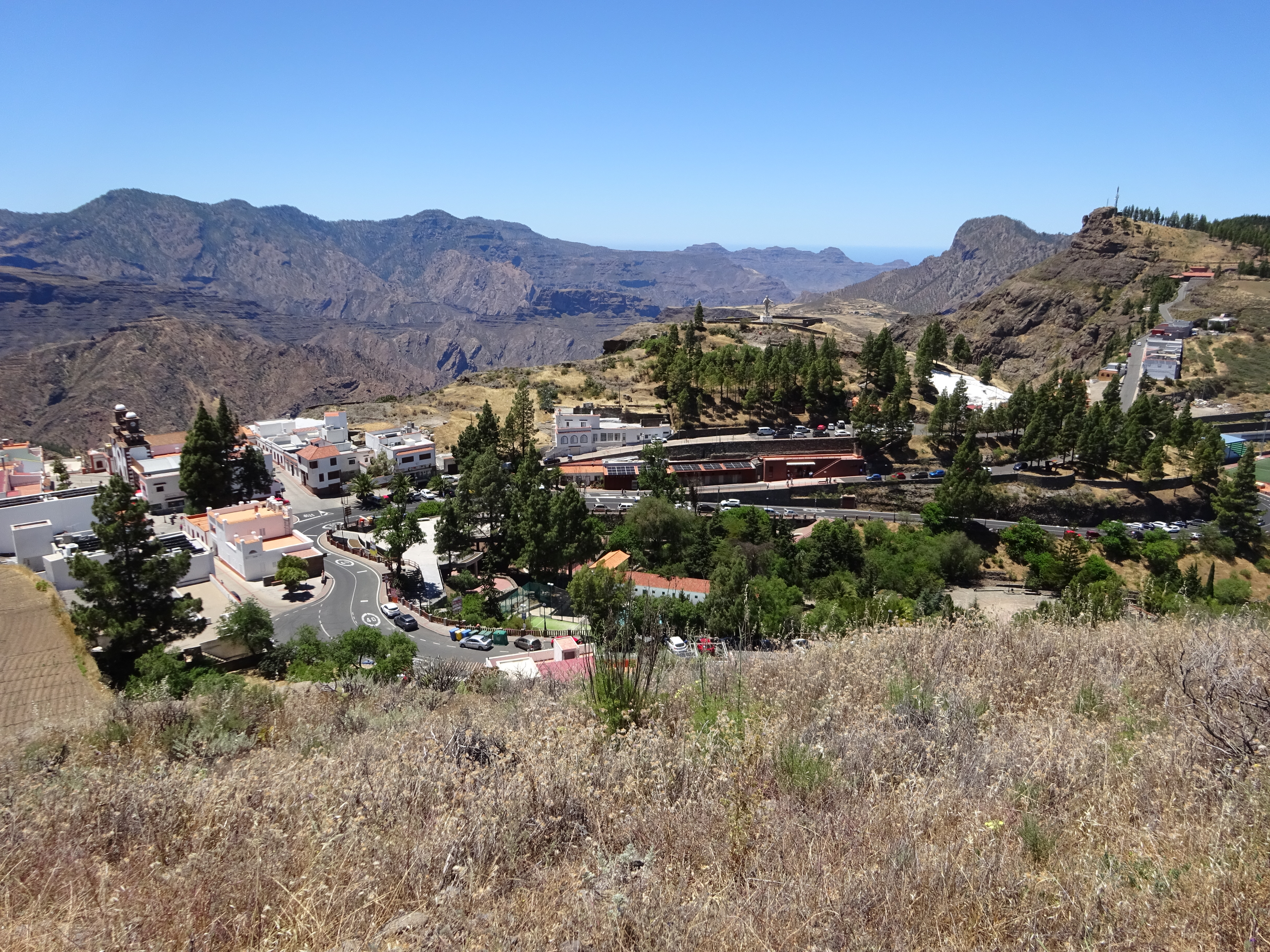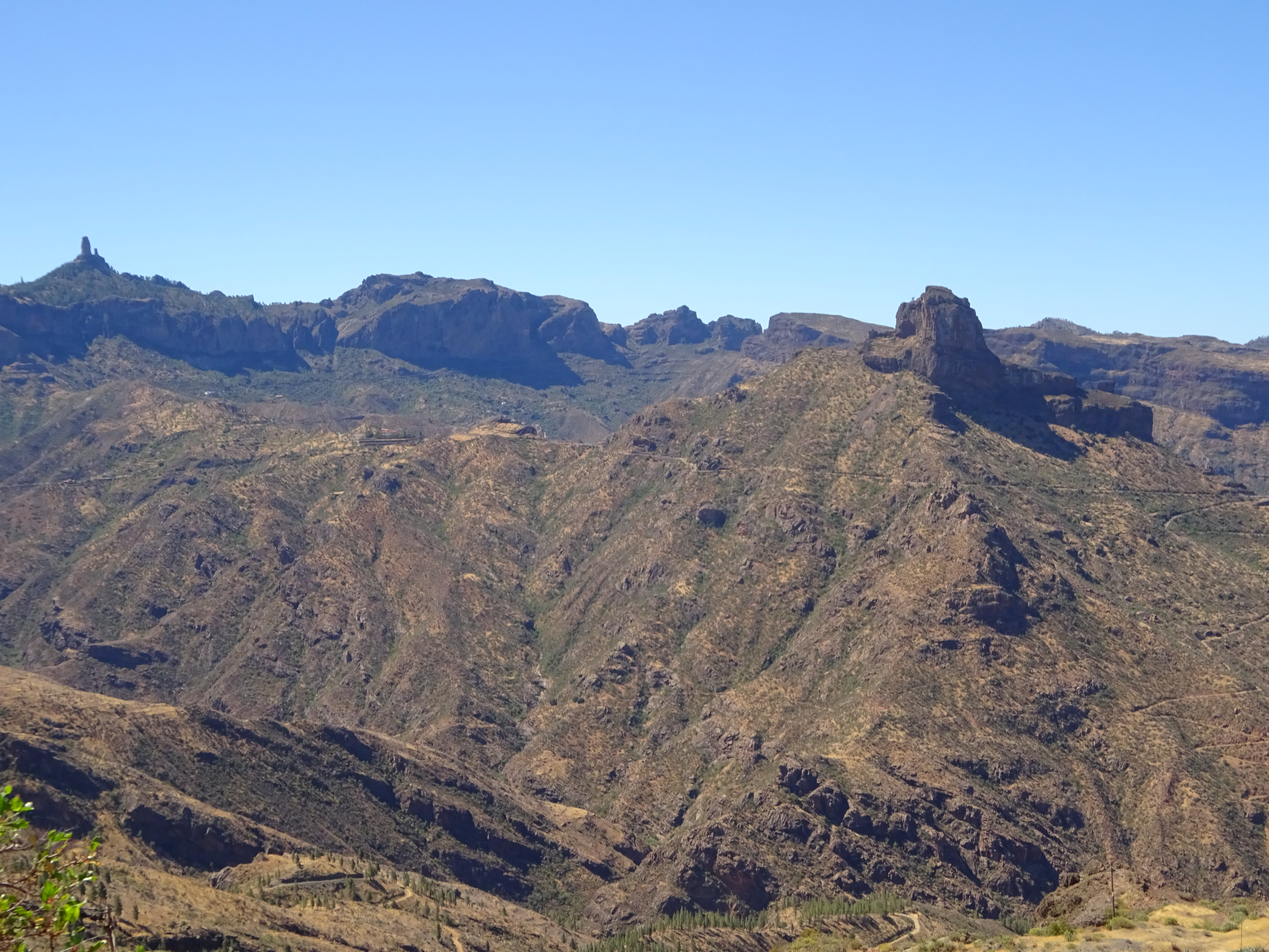 La calle asfaltada sube bordeando el risco. A la derecha amplios panoramas sobre los roques del centro de la isla, el Bentayga y el archifamoso Roque Nublo.