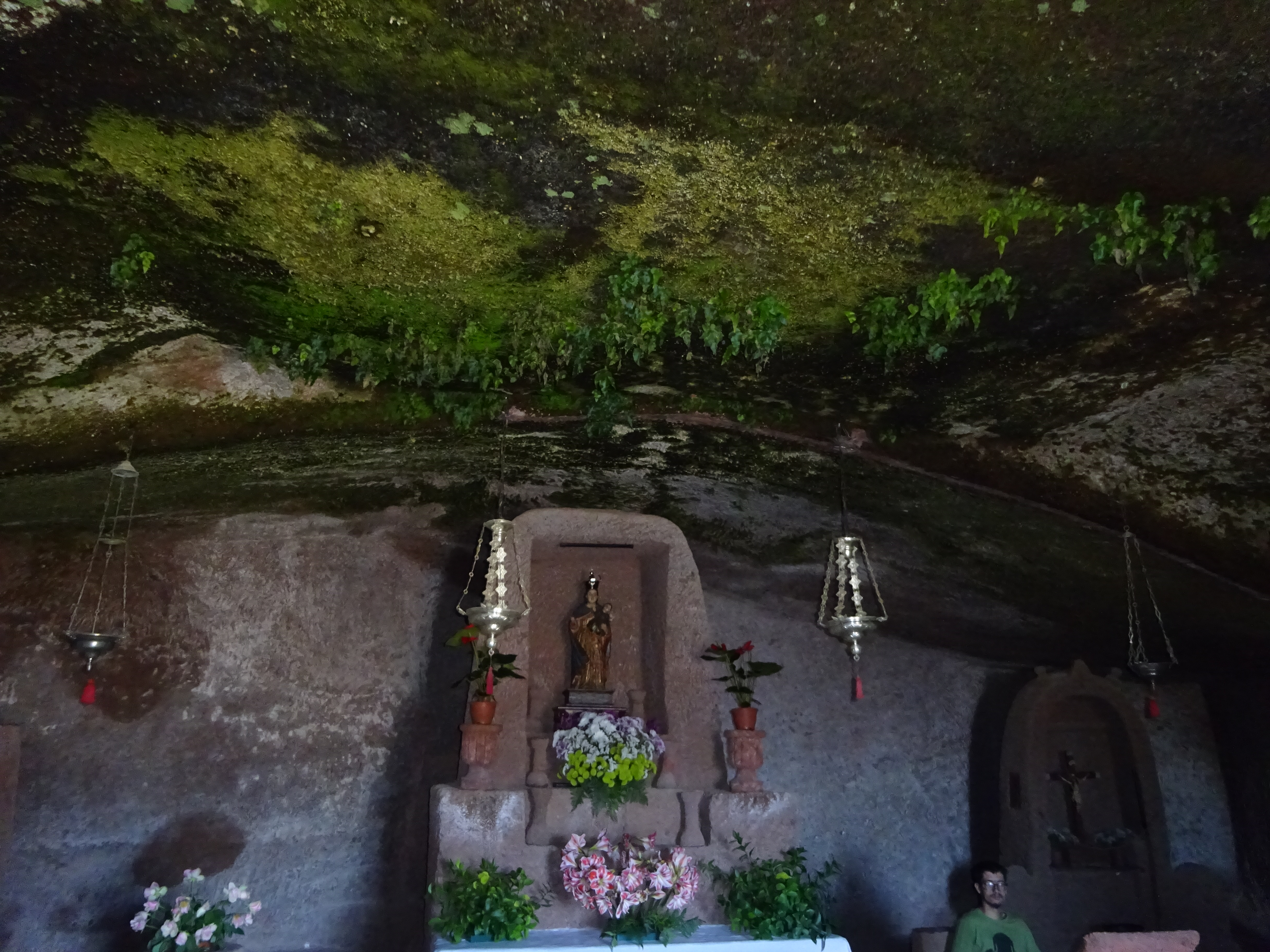 El interior, fresco y húmedo, aloja un bonito altar con la imagen de la Virgen, patrona del pueblo, presidiéndolo. Una pareja de jovencitos locales nos explica que aquí dentro suelen vivir murciélagos, aunque nosotros no tenemos la suerte de verlos.