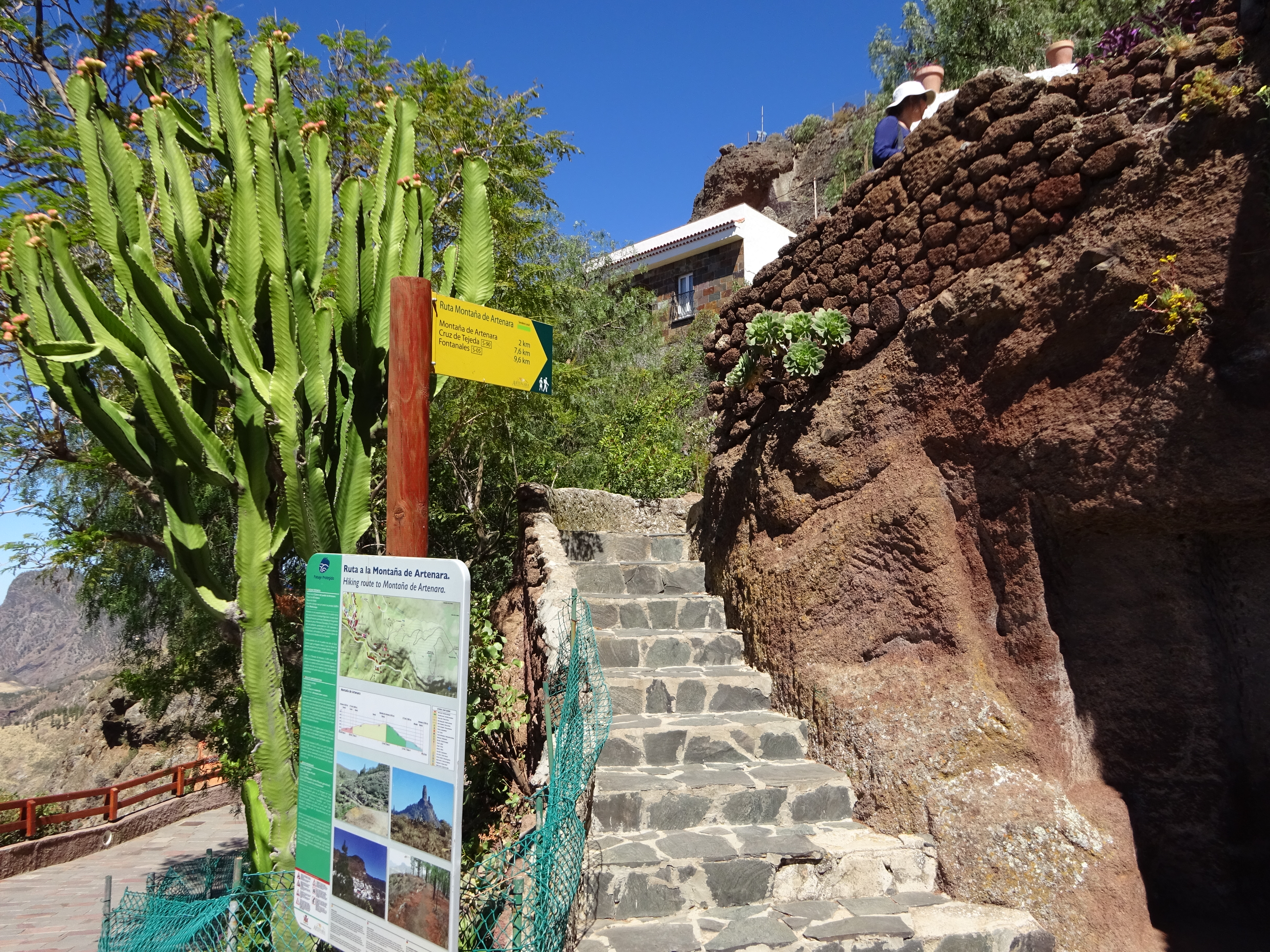 Finalizado el turisteo, hincamos el diente en serio a la montaña. Junto a la ermita, semiocultas tras una frondosa chumbera, unas escaleras muy verticales permiten superar la pared. La ruta se encuentra perfectamente señalizada, incluyendo un panel informativo sobre los senderos y la geología de la Montaña de Artenara. Pasamos junto a algunas casas antes de llegar arriba, donde encontramos la pista que rodea la escarpadura por detrás, y que utilizaremos a la vuelta.