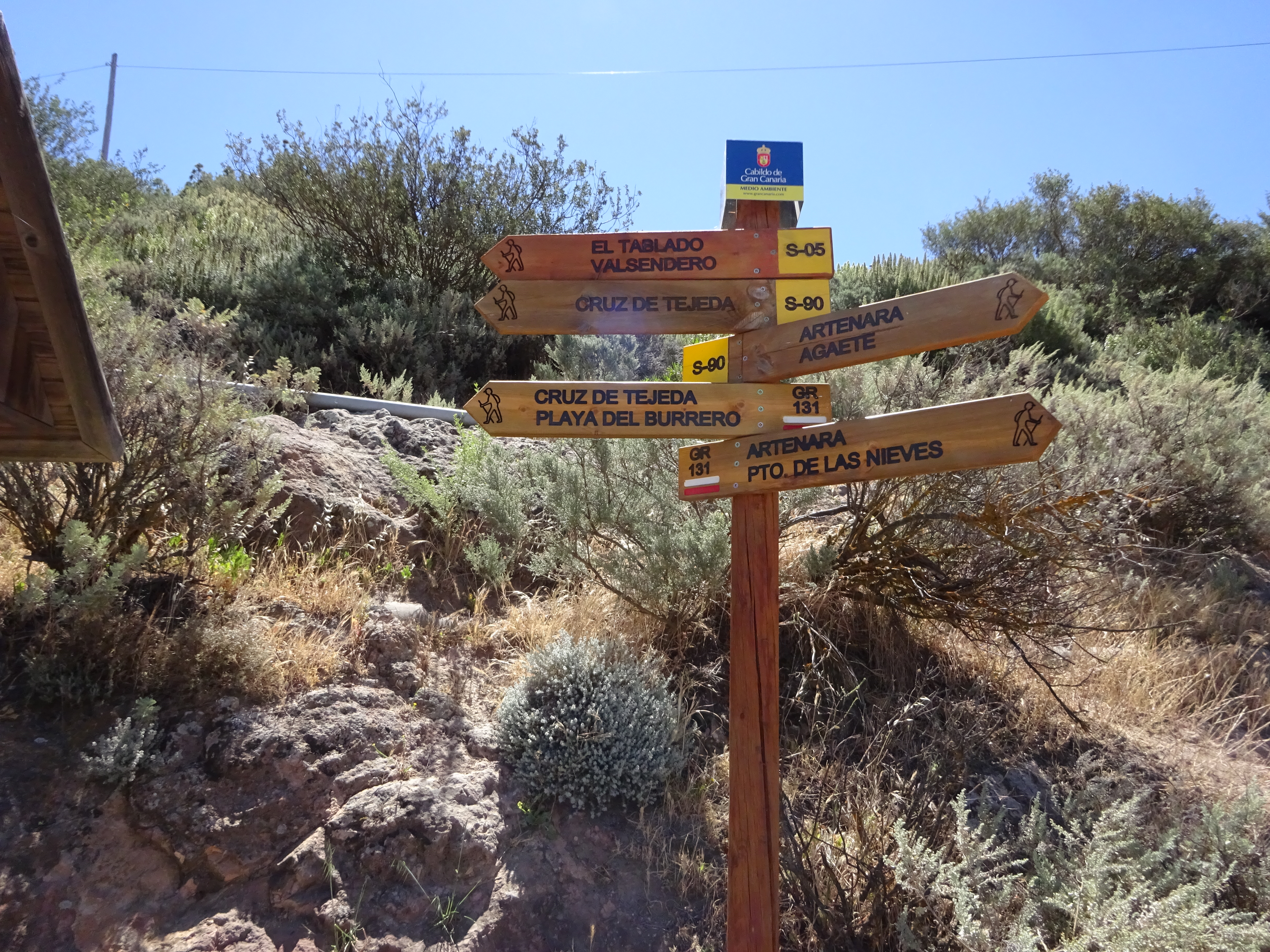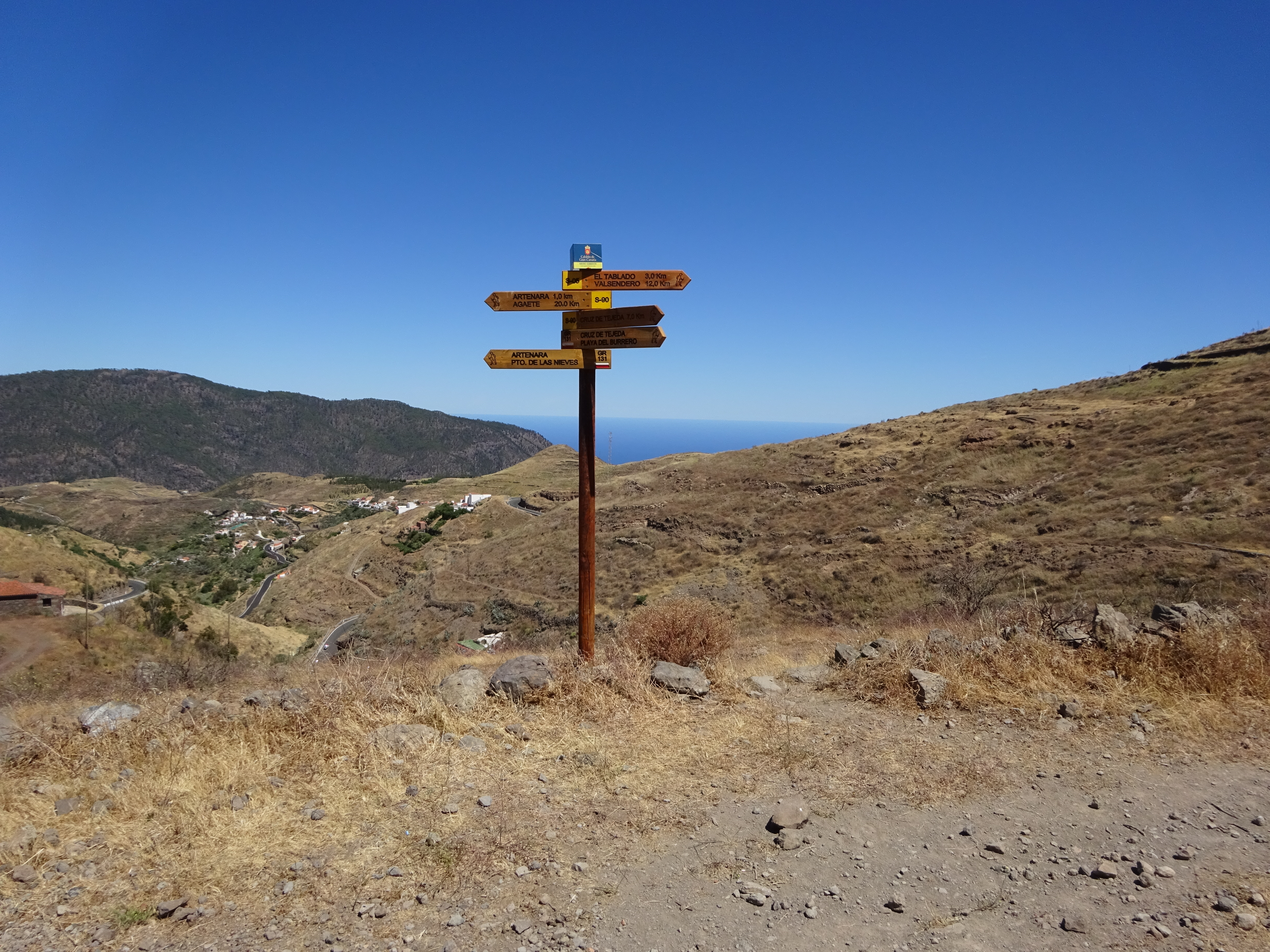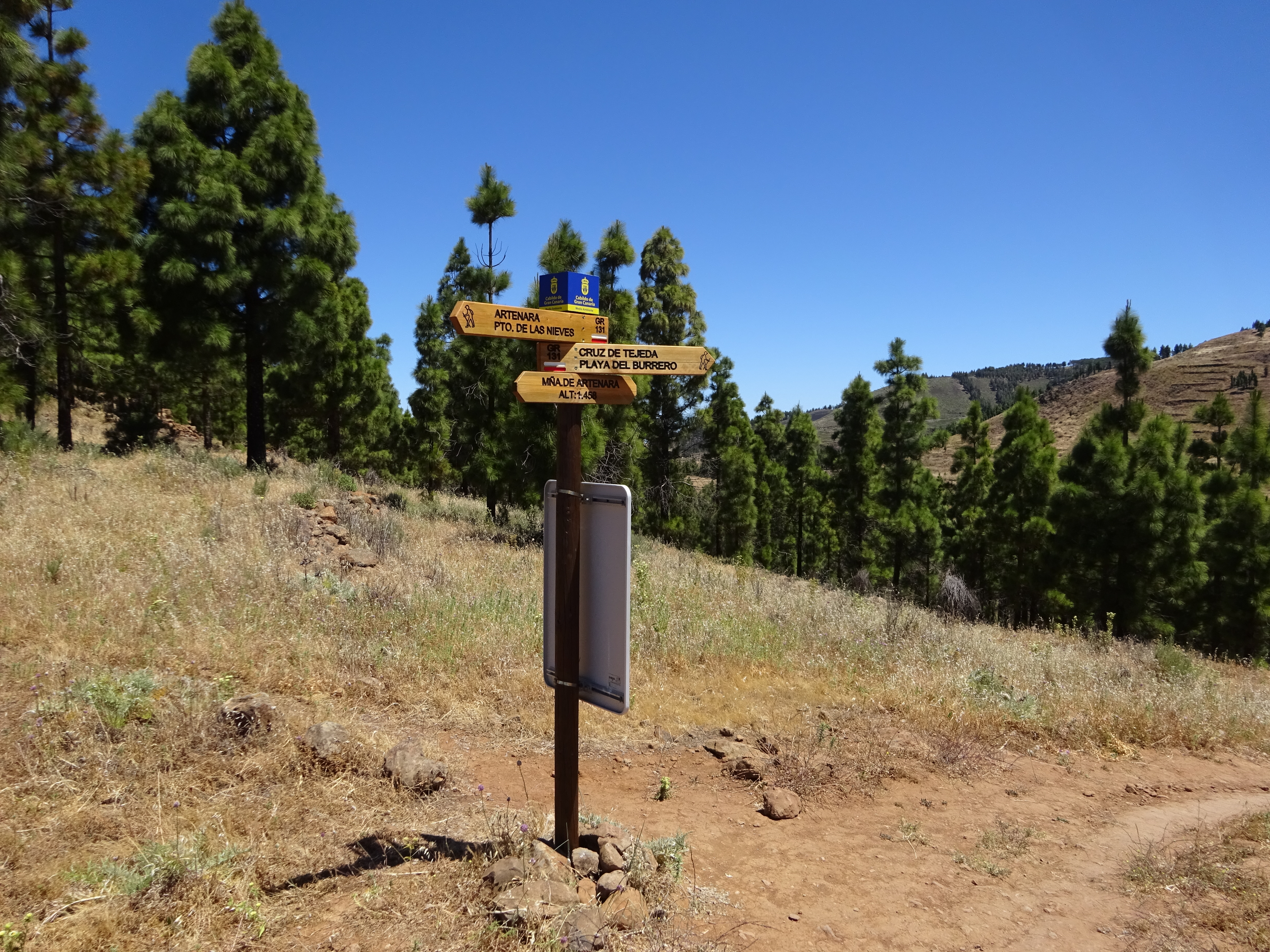 Aquí seguimos las señales que indican el descenso en dirección Artenara. Si siguiéramos los senderos en dirección contraria llegaríamos en unos 3 km a la cima del Moriscos y en 4 km a la carretera GC-150 a la altura del Mirador de la Degollada.