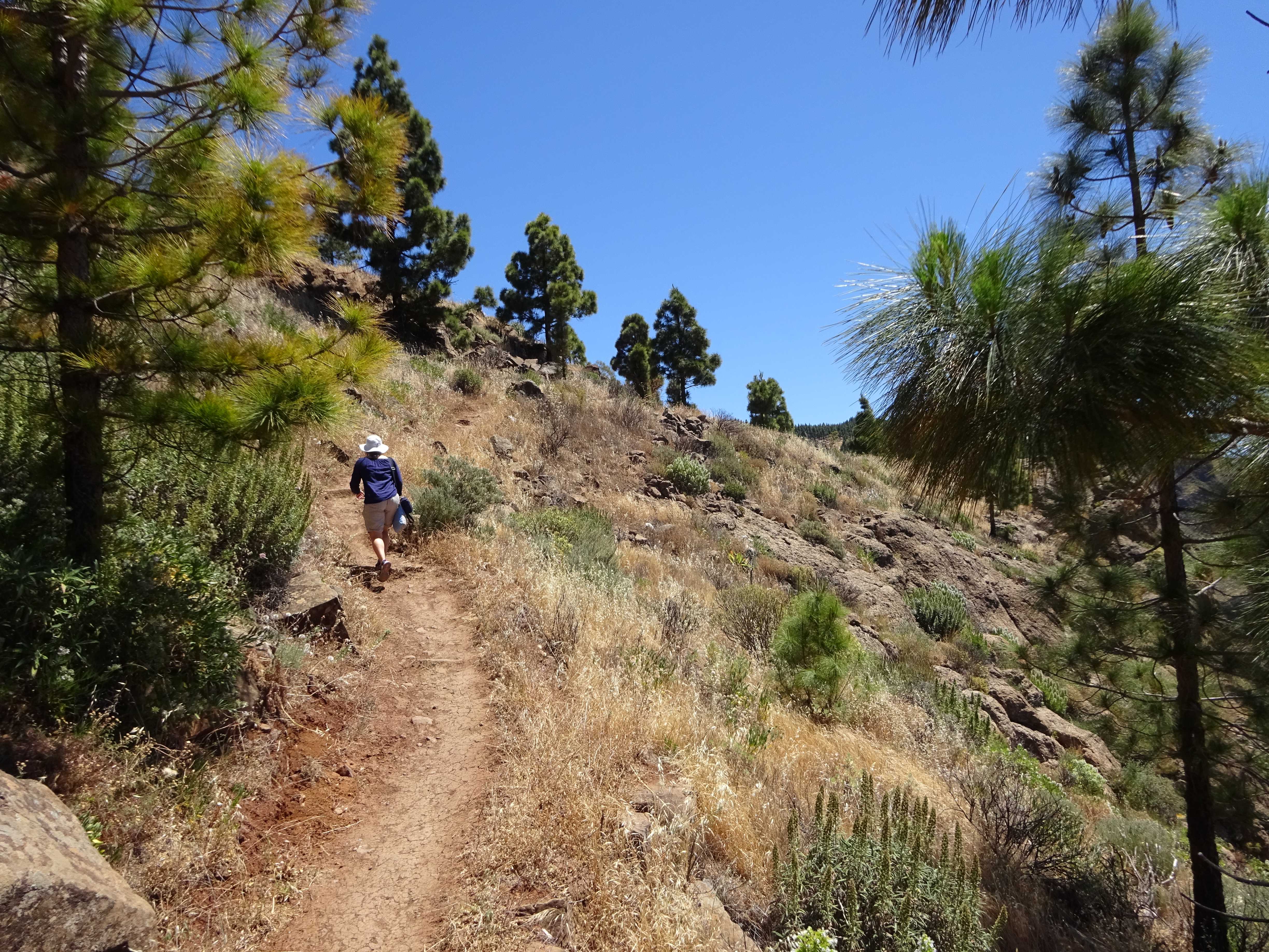 Deshacemos durante algunos cientos de metros el camino de la ida hasta dar con la pista donde desembocan las escaleras de la Cuevita, en poco menos de media hora desde la cima. En esta ocasión progresaremos por la pista que rodea por detrás la loma bajo la que se asienta Artenara.
