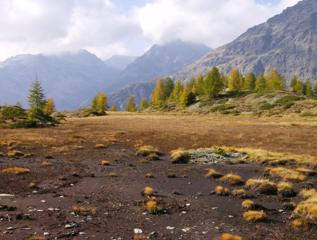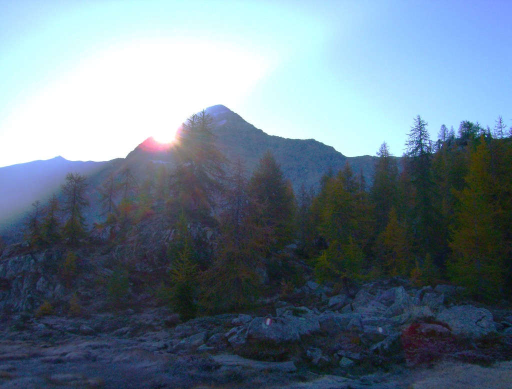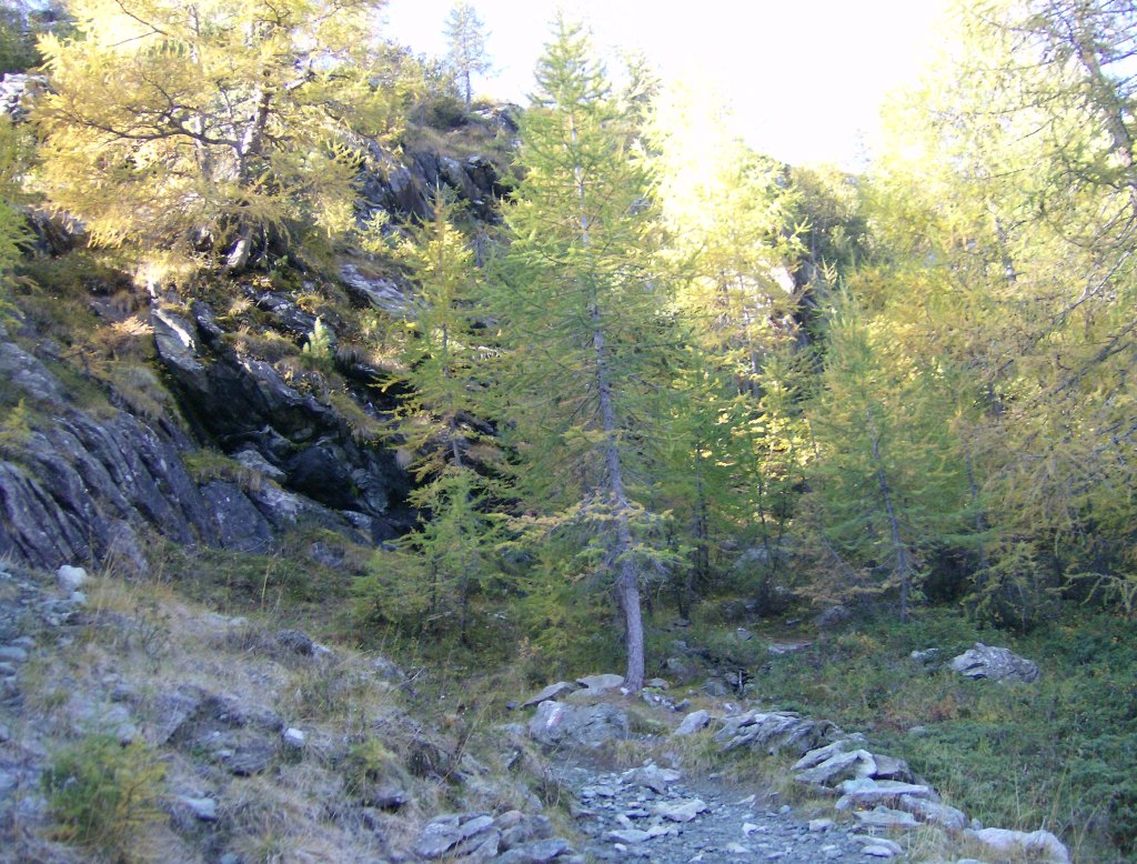 Después de una media hora, empiezo la bajada. Sin la menor amenaza de cambio de tiempo en el horizonte, sólo tengo que dejarme ir y gozar del ambiente que me rodea. Cuando termino el descenso propiamente dicho, y con él los peligros de resbalones y caídas, en las inmediaciones del Alpe Prabello, las vistas son maravillosas. La cálida luz de otoño, con el día declinando, realza los colores del cielo y de los bosques de alerces que ya empiezan a amarillear.
