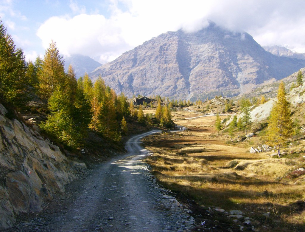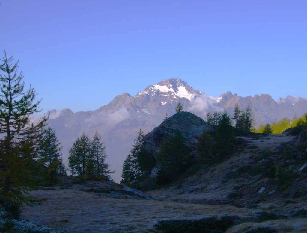 Más adelante el sendero se junta con la pista que llega desde el Refugio Ca’Runcatsch. Hacia el Oeste, el Sol levante ilumina el Monte Disgrazia (3678 m), una de las montañas más prestigiosas de Lombardía.