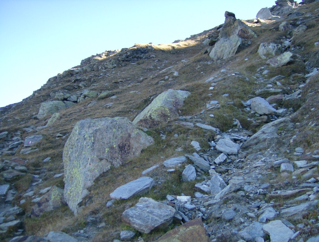 El sendero, estrecho y pedregoso, remonta fatigosamente la inclinada pendiente. La mole que tengo encima me mantiene al reparo de los cálidos rayos del Sol, que empiezo a echar en falta. En cambio, el embalse de Campo Moro y la cadena del Bernina están ya bañados por la luz de la mañana.