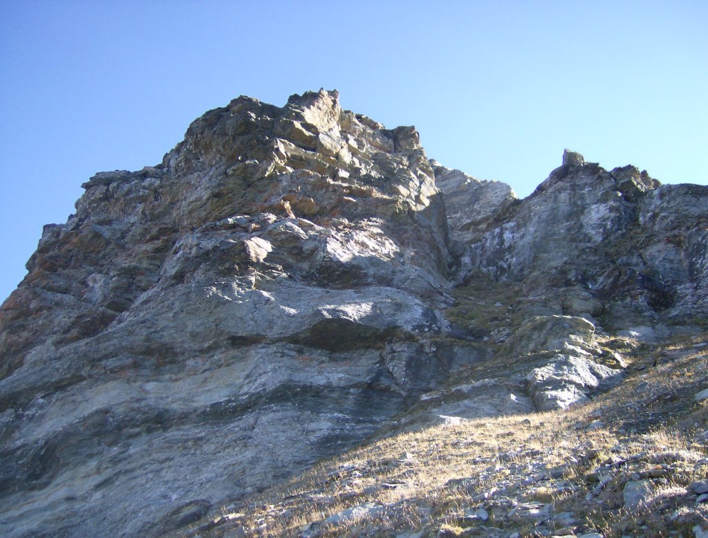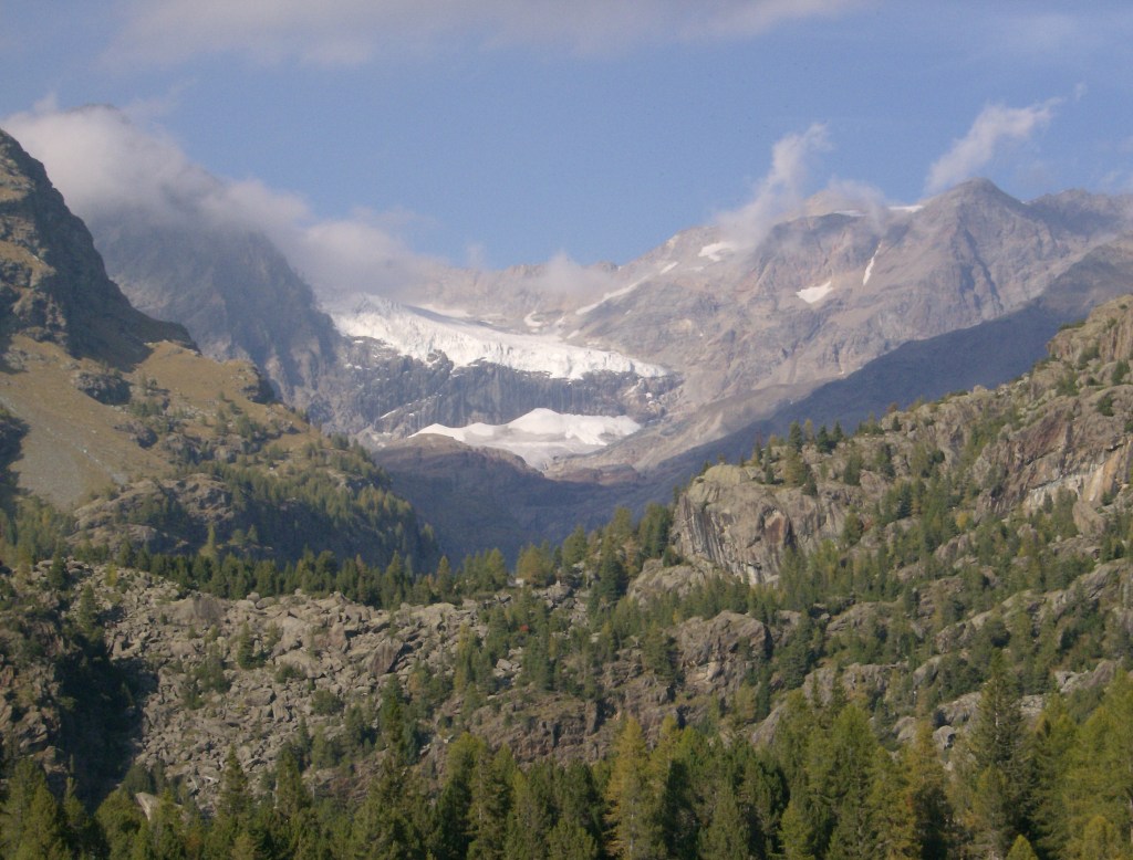 Desde aquí se aprecia mejor la verdadera rimaya, situada por encima de donde he pasado, dificultando el acceso al collado de Val Fontana. Acostumbrado a las grandes extensiones de hielo de los cuatromiles, este glaciar es «pequeño», pero no cabe comparación con nuestros glaciares pirenaicos. Decididamente aquí hay que venir con equipo apropiado, y pensárselo bien antes de meterse en una solitaria.