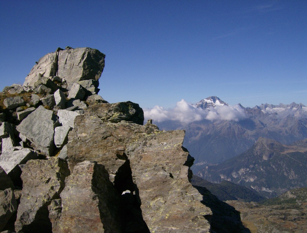 Hacia el oeste, el Monte Disgrazia y la Valmalenco atraen la mirada. Las nubes impiden la visión de horizontes más lejanos, pero a la izquierda del Disgrazia pueden divisarse, con tiempo claro, El Monte Rosa e incluso e Gran Paradiso.